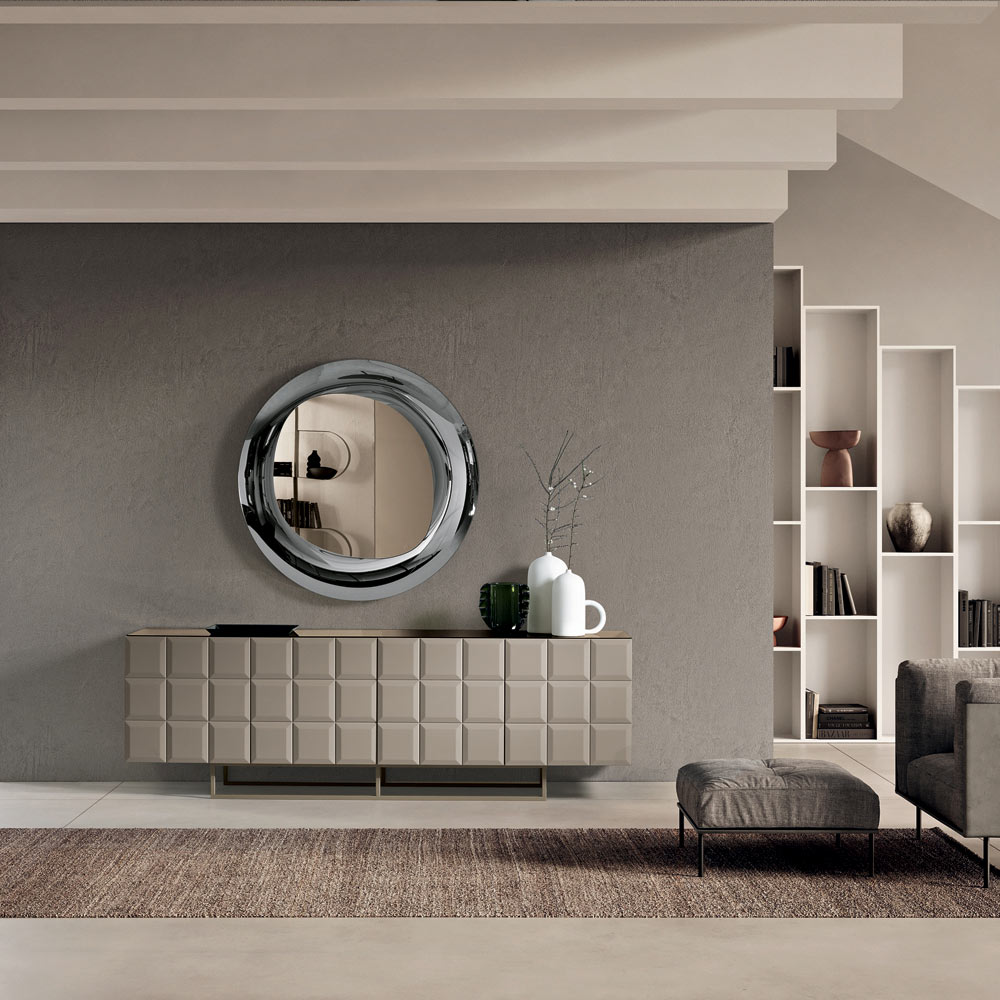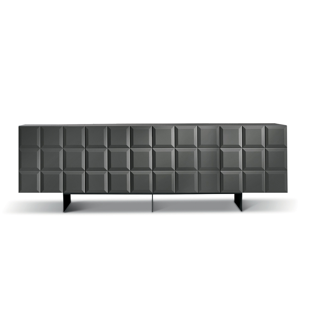 De met melamine beklede romp is gecombineerd met een gelakte metalen voet , verkrijgbaar in diverse uitvoeringen, wat de structuur stroomlijnt en een visuele lichtheid geeft. Het dressoir kan worden afgewerkt met een spiegelend glazen blad voor een nog verfijnder effect.