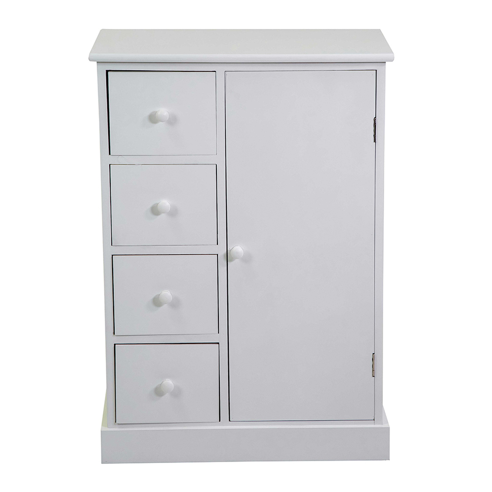 Met 4 zijlades en 1 deur, biedt het een grote opbergoplossing die perfect is voor het opbergen van alledaagse voorwerpen, keukengerei, textiel of documenten, om alles opgeruimd en uit het zicht te houden. De strakke lijnen en het minimale ontwerp maken het uiterst veelzijdig: perfect voor woonkamers, slaapkamers, badkamers of entrees.