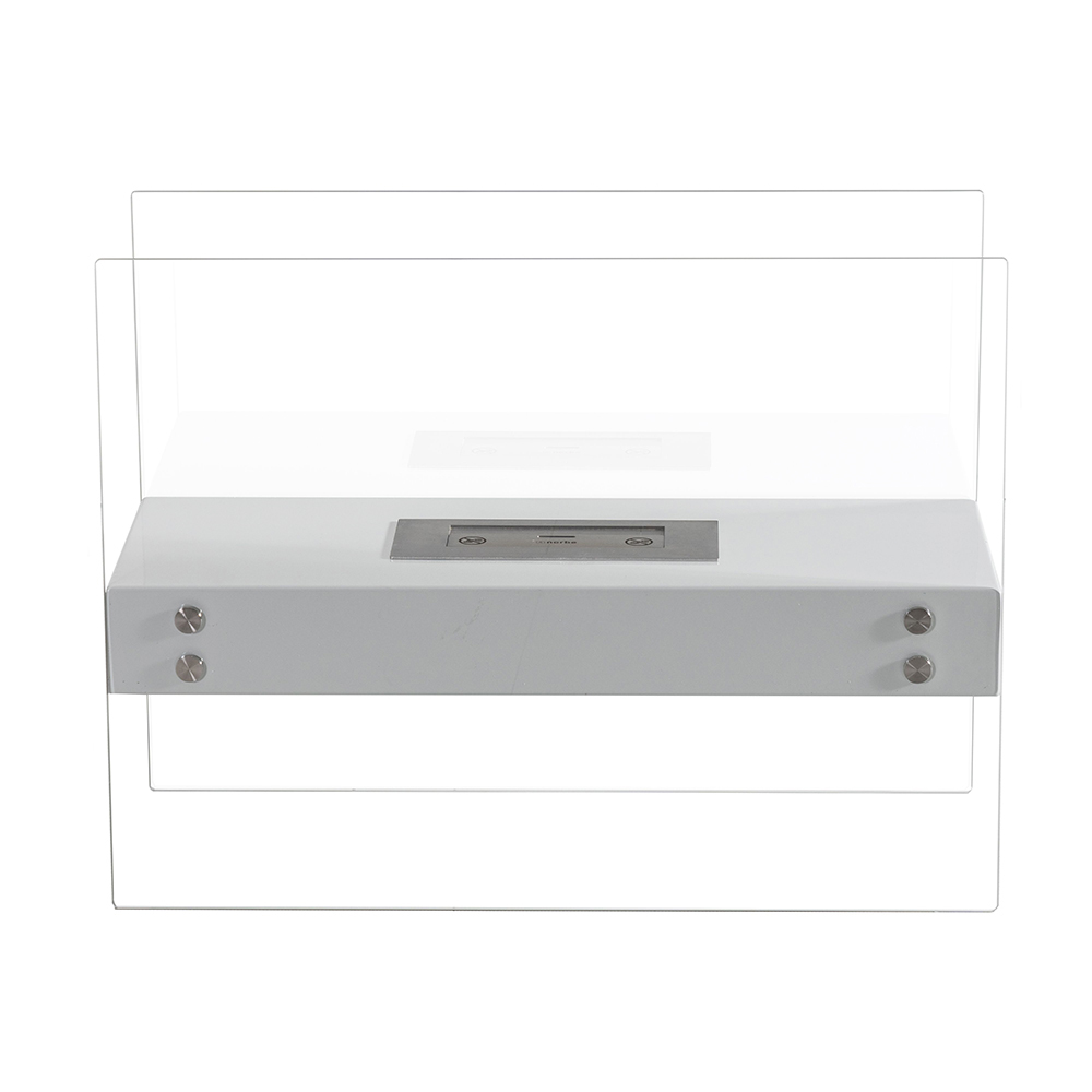 witte metalen structuur en gehard glas dat de vlam beschermt tegen windvlagen en deze benadrukt.