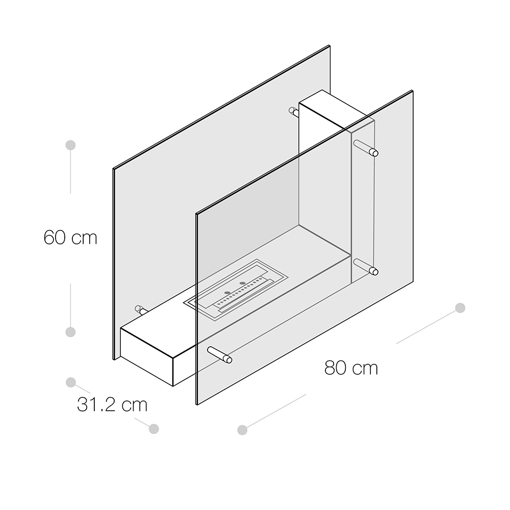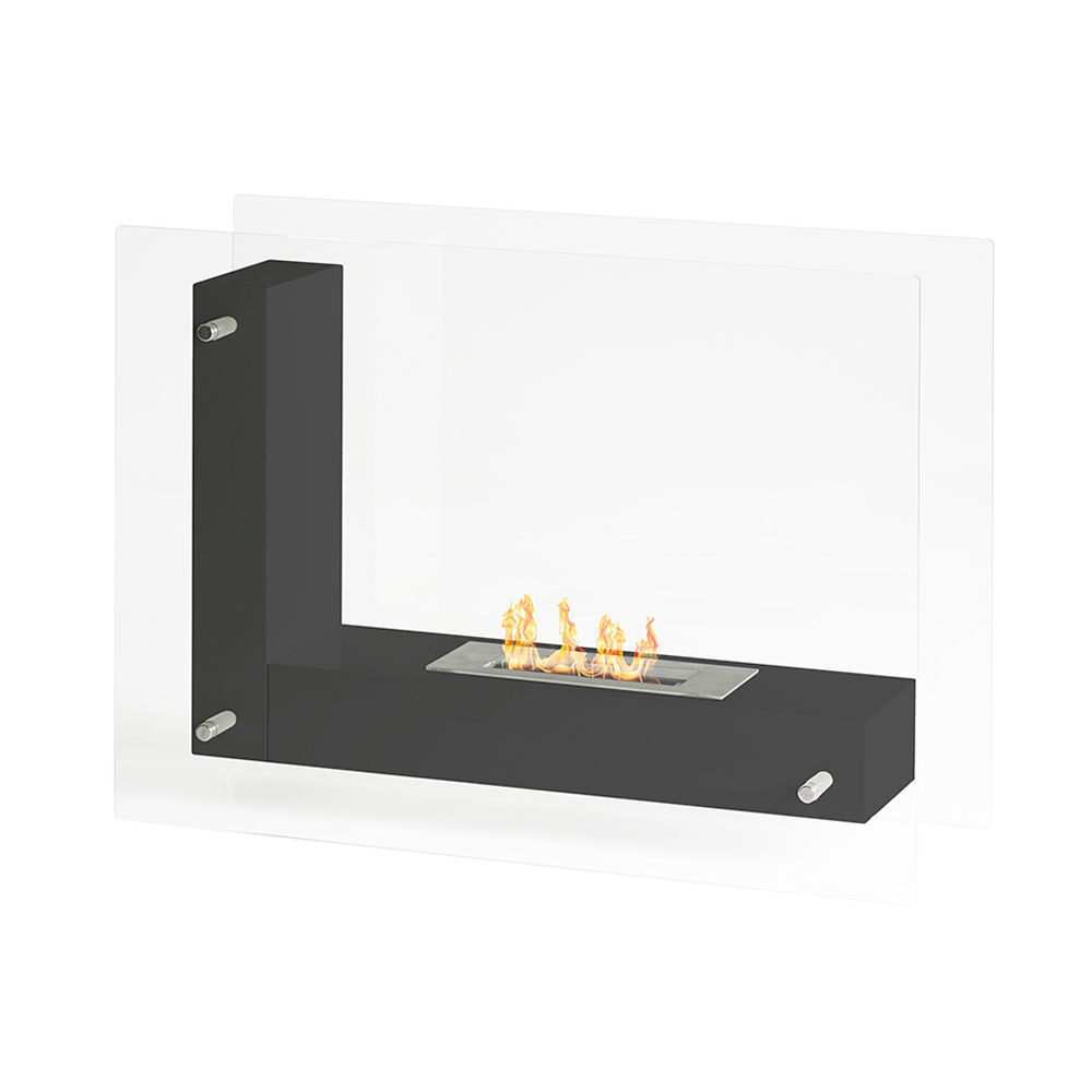 Gemaakt met een L-vormige structuur van zwart metaal en gehard glas , geplaatst aan de zijkanten, beschermt het de vlam tegen windvlagen en benadrukt het deze.