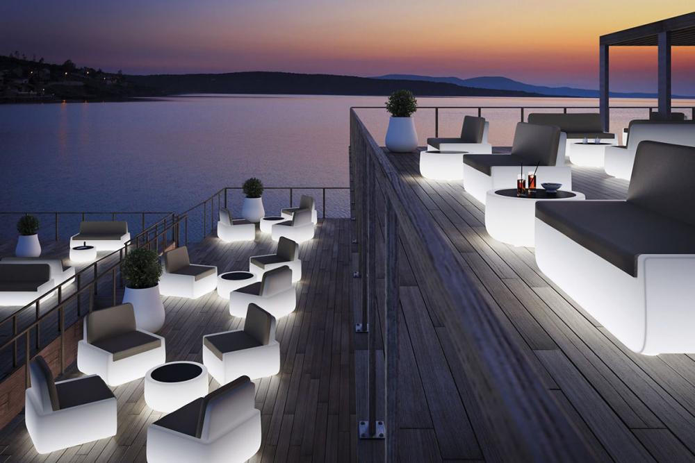 Deze meubels of accessoires zijn meestal gemaakt van polyethyleen, een zeer resistent en veelzijdig materiaal , doorschijnend gemaakt om het licht naar de led naar binnen te laten gaan, waardoor een diffuus en sfeervol licht ontstaat.