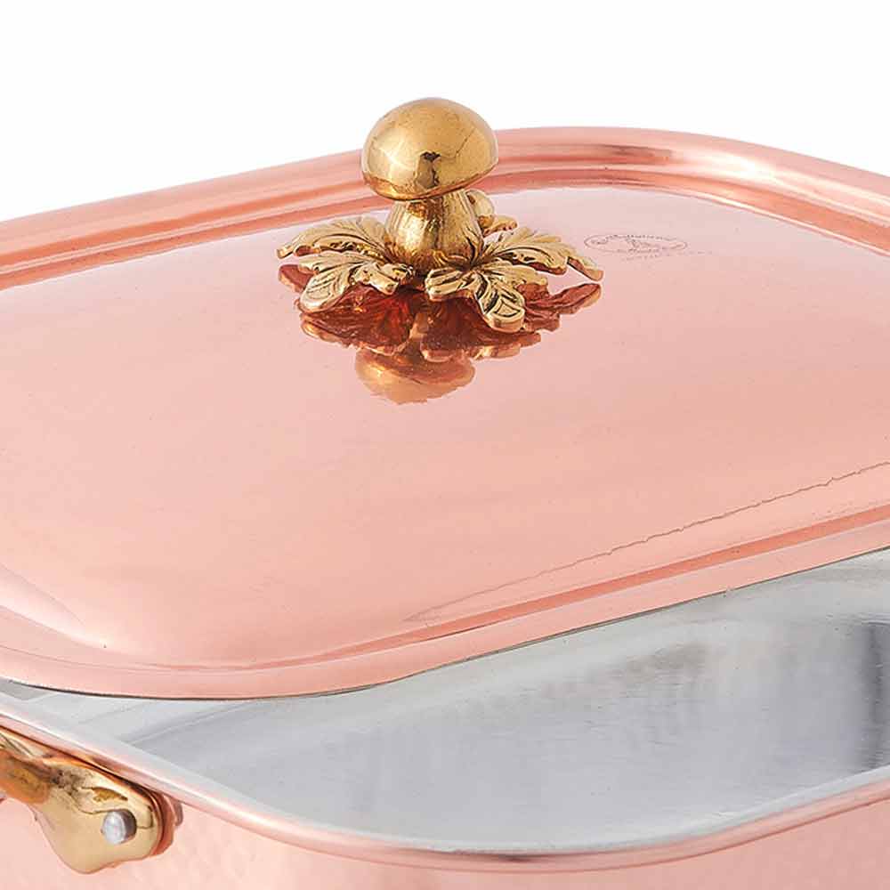 Rechthoekige koperen braadpan met messing deksel en handgrepen, ambachtelijk gemaakt in Italië.