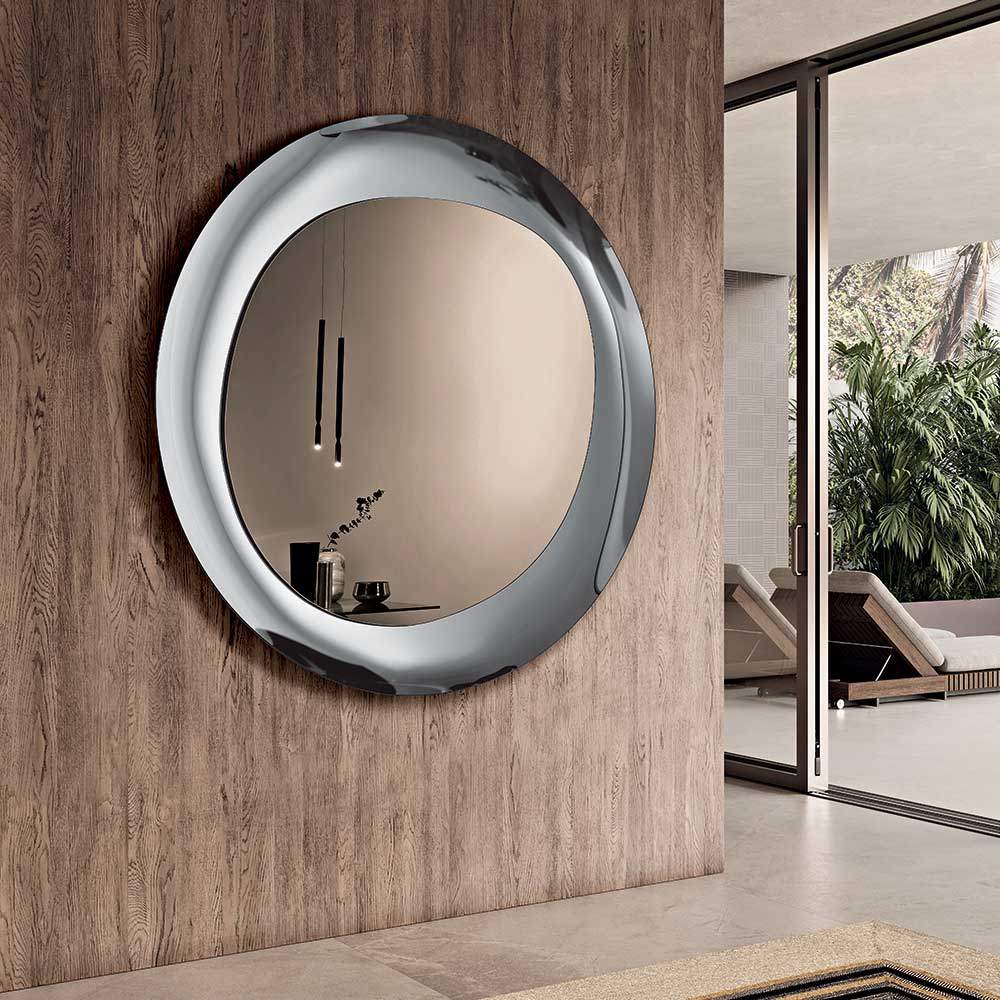 Een elegante, in Italië vervaardigde designwandspiegel, ontworpen om ruimtes zoals de hal , woonkamer of slaapkamer te verfraaien. Het verfijnde ontwerp combineert zachte vormen met hoogwaardige materialen, waardoor de spiegel een decoratief element met een sterk karakter wordt.