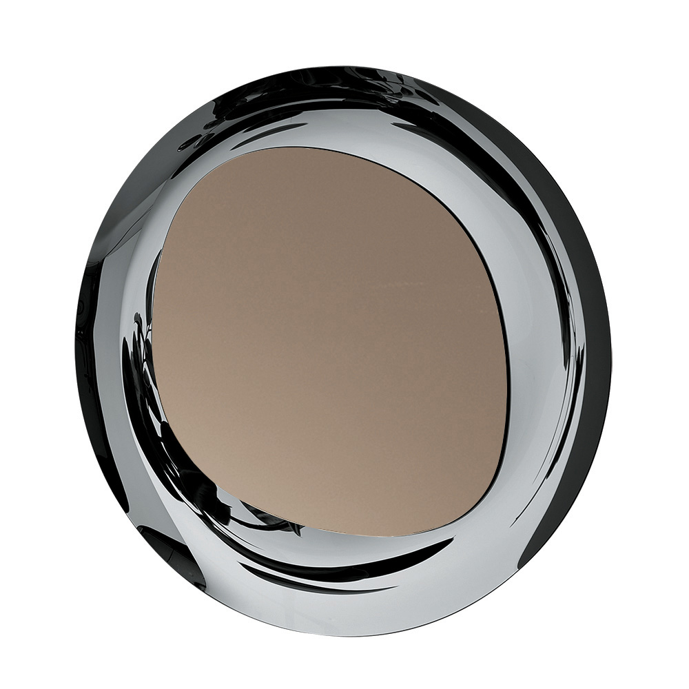 De spiegel bestaat uit een gevormde plaat met een bronzen afwerking, die rust op een rond frame van rookglas . De samensmelting van de oppervlakken en de verschillende volumes creëert een elegant samenspel van contrasten tussen vorm en materiaal, wat resulteert in een verfijnd en tijdloos object dat elke muur kan verfraaien.