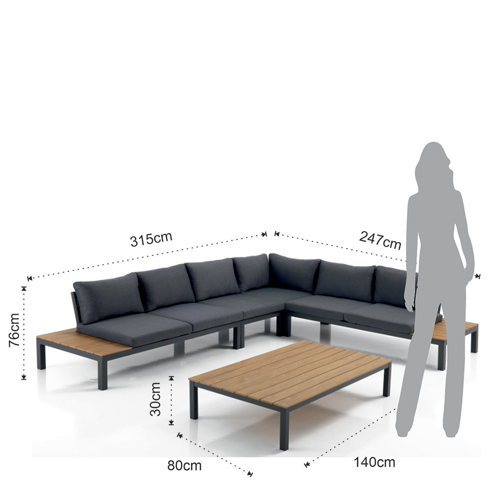 | Maatregelen | bank: 315x247x76 cm / salontafel: 80x140x30 cm |