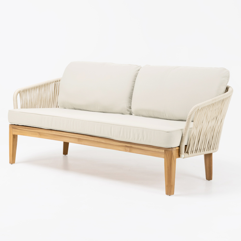 Buitenbank in teakhout en polyethyleen weefsel met kussens.