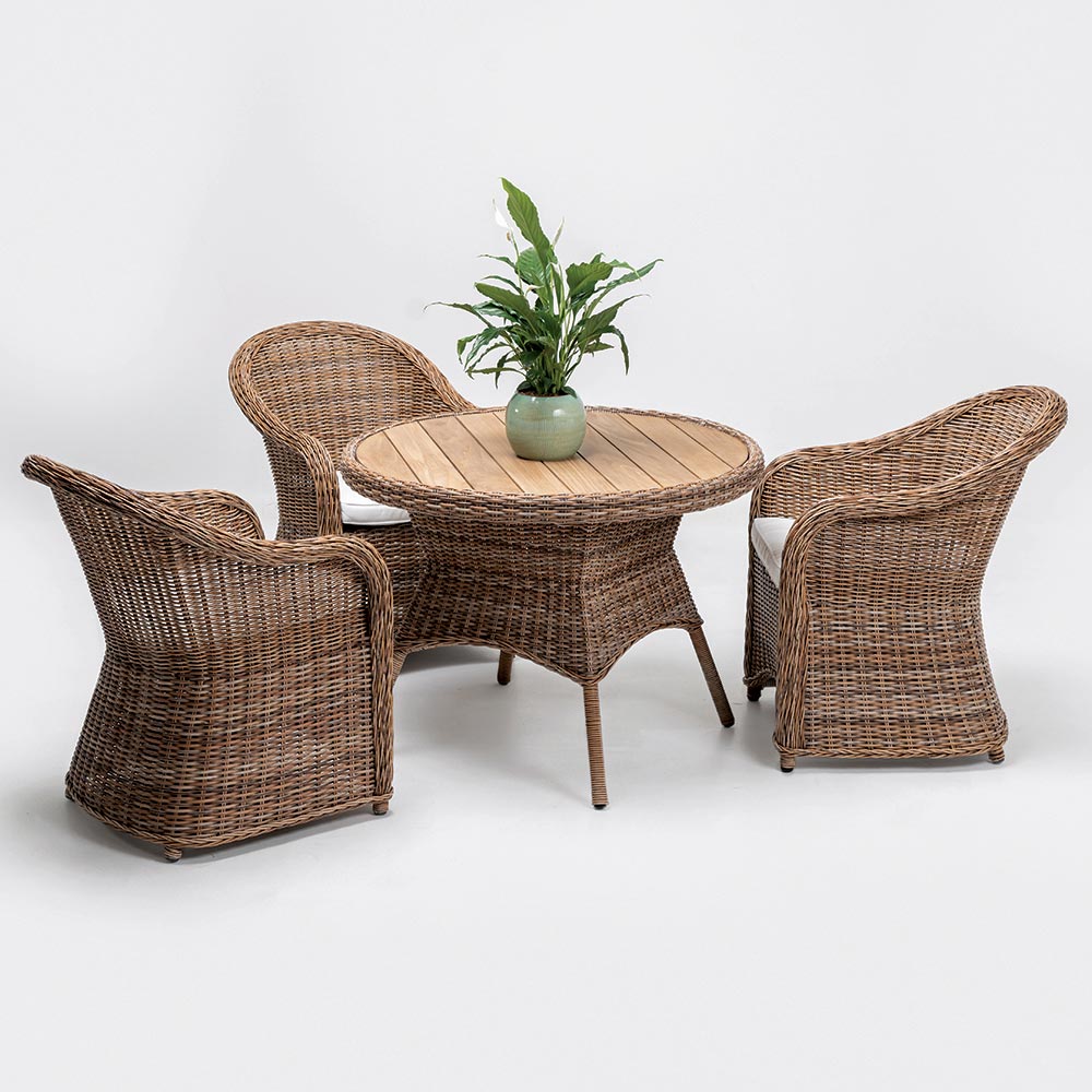 De organische vorm en textuur van het polyrotan voegen een gevoel van warmte en rustieke elegantie toe, terwijl de slanke poten van de tafel geleidelijk naar de grond reiken, wat zorgt voor stabiliteit en een onderscheidende stijl. Het is het soort meubelstuk dat naadloos opgaat in het groen van een tuin of betegeld terras en een ontmoetingspunt creëert tussen natuur en huiselijk comfort.