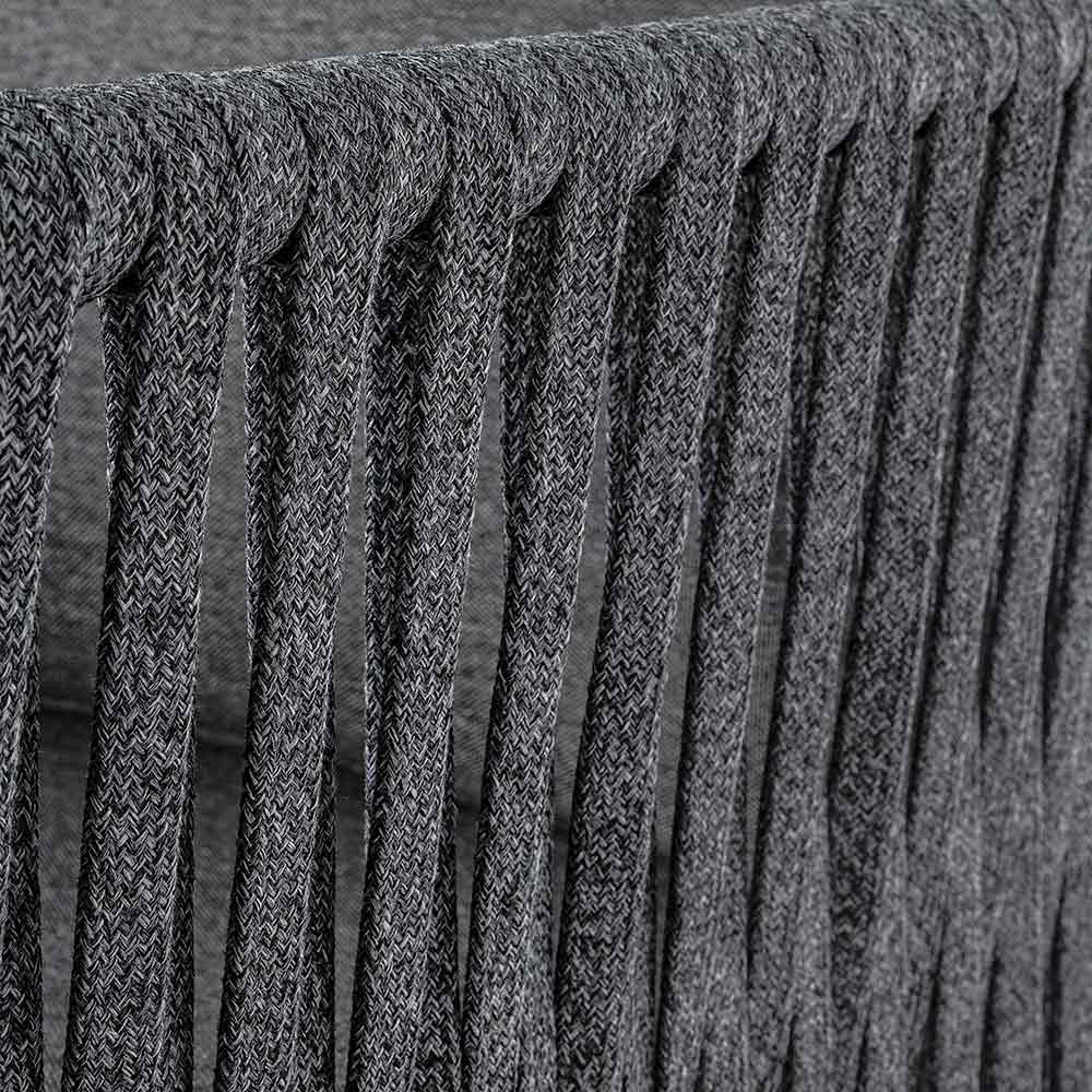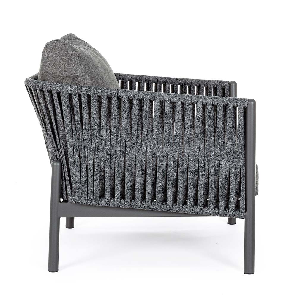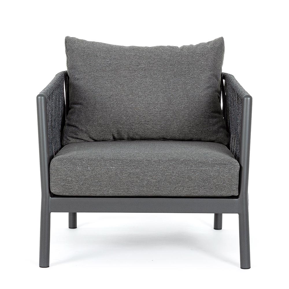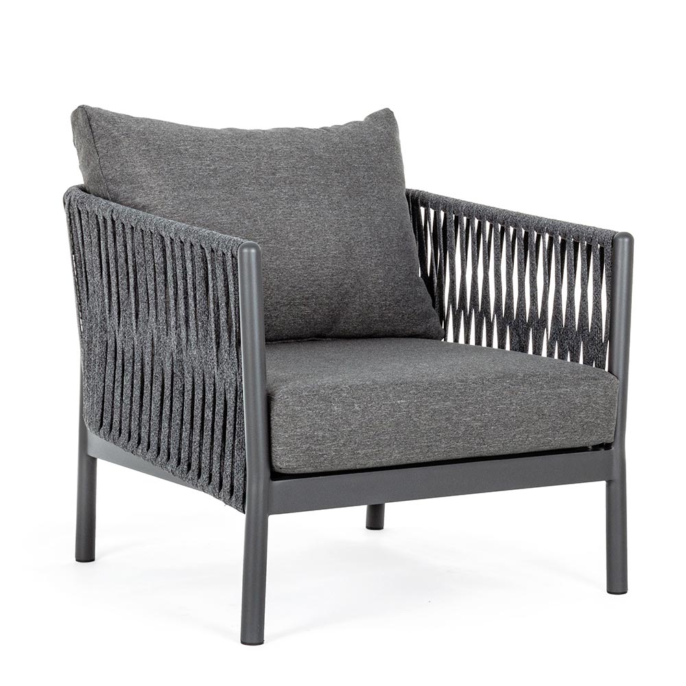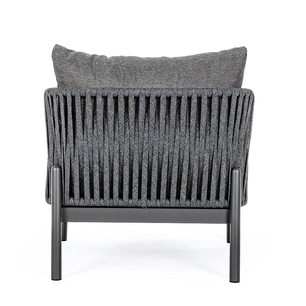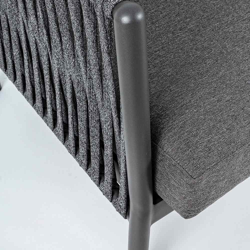 Buitenfauteuil met aluminium structuur en rugleuning van geweven touw.