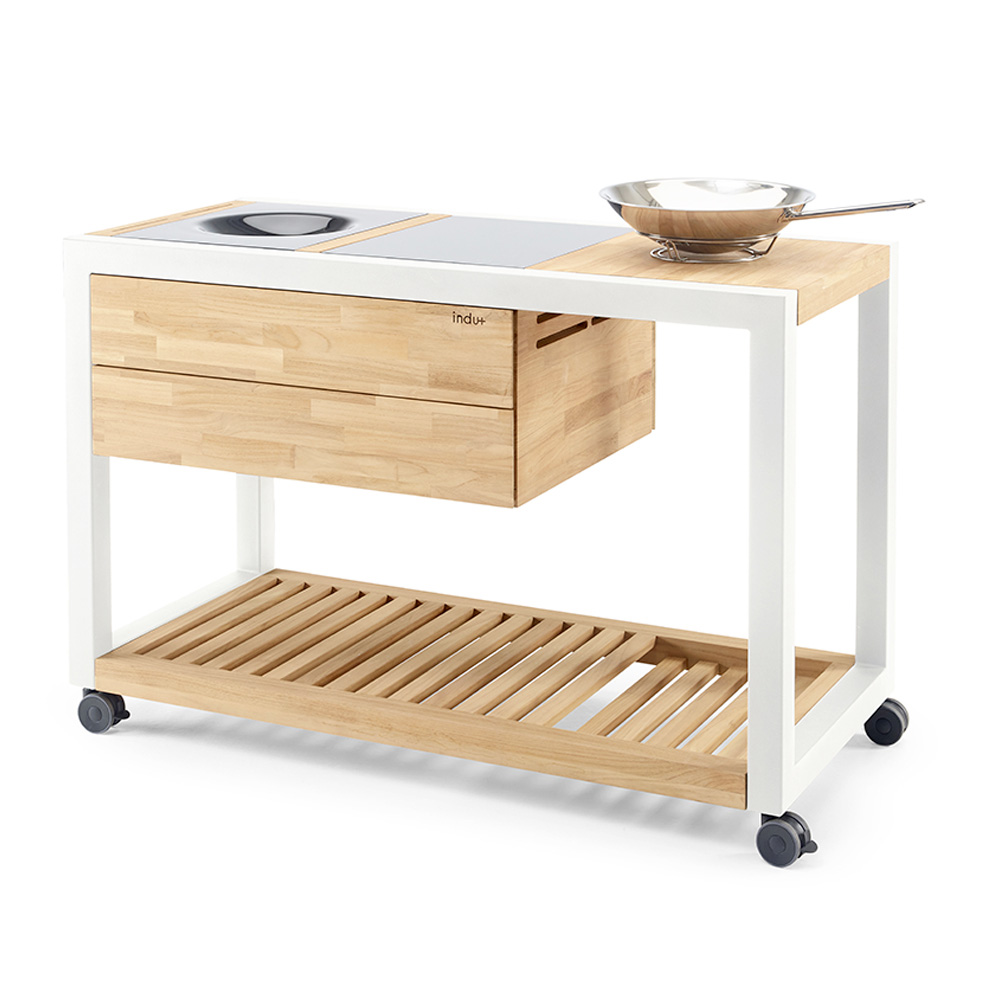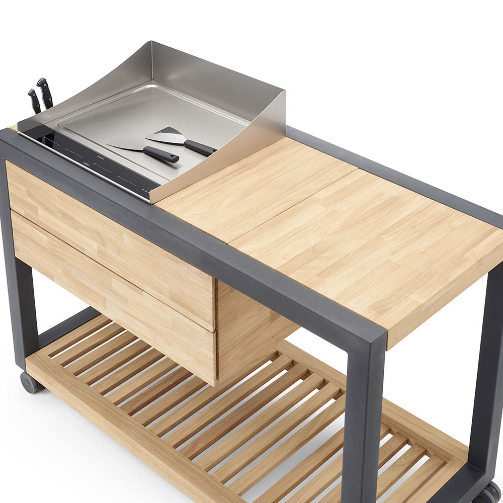 Deze buitenkeuken vertegenwoordigt de perfecte mix van functionaliteit en eigentijds design, ideaal om van elk buitenmoment een unieke ervaring te maken. Het poeder-gecoat aluminium frame biedt robuustheid en weerbestendigheid, terwijl de high-quality massief teak inzetstukken behandeld met Rubio Monocoat Hybrid Wood Protector een vleugje natuurlijke elegantie en visuele warmte toevoegen.