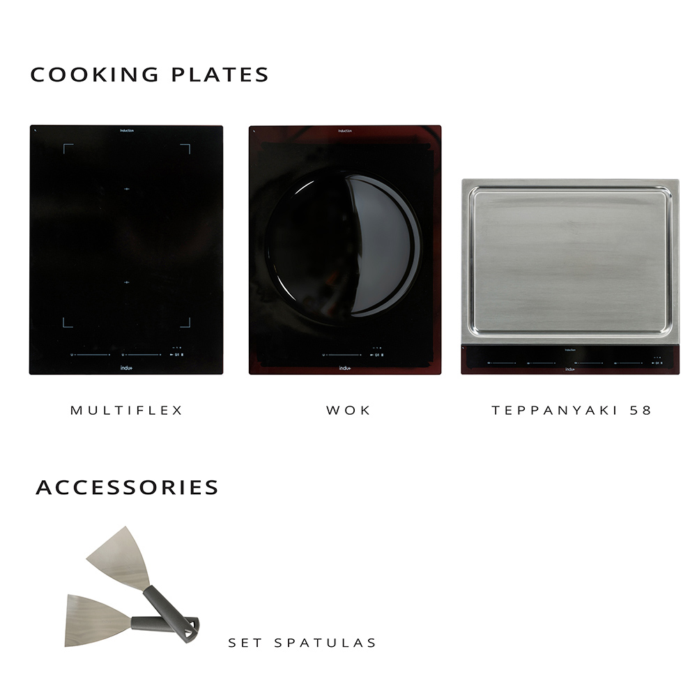 TEPPANYAKI 38/58: state-of-the-art inductietechnologie - locking touch - Stop & go functie - 2 onafhankelijke thermostatisch geregelde kookzones (voor en achter) - elk 1400 W - touch slider bediening met directe toegang tot elk van de 10 verwarmingsniveaus: 0-9 / reinigingsniveau - dynamische temperatuurweergave voor beide kookzones - reinigingstoetsen voor elke zone