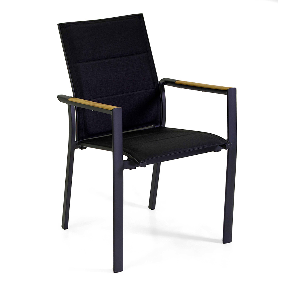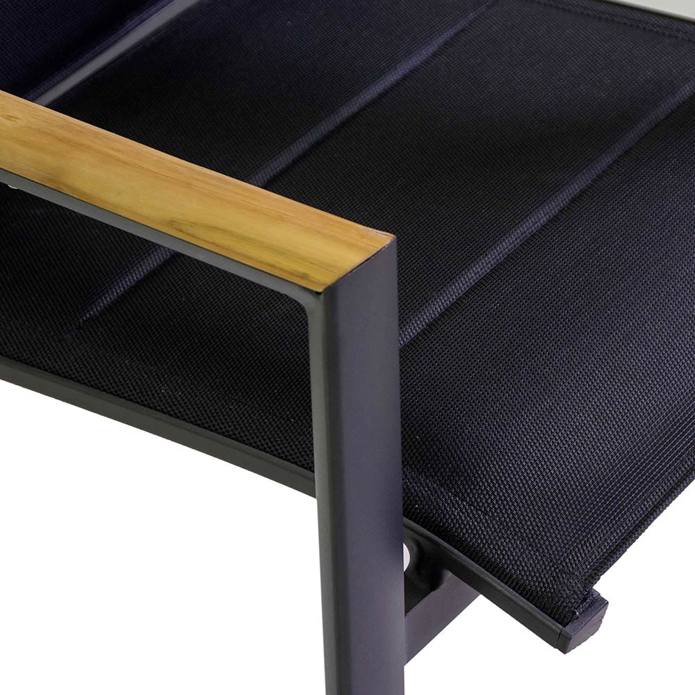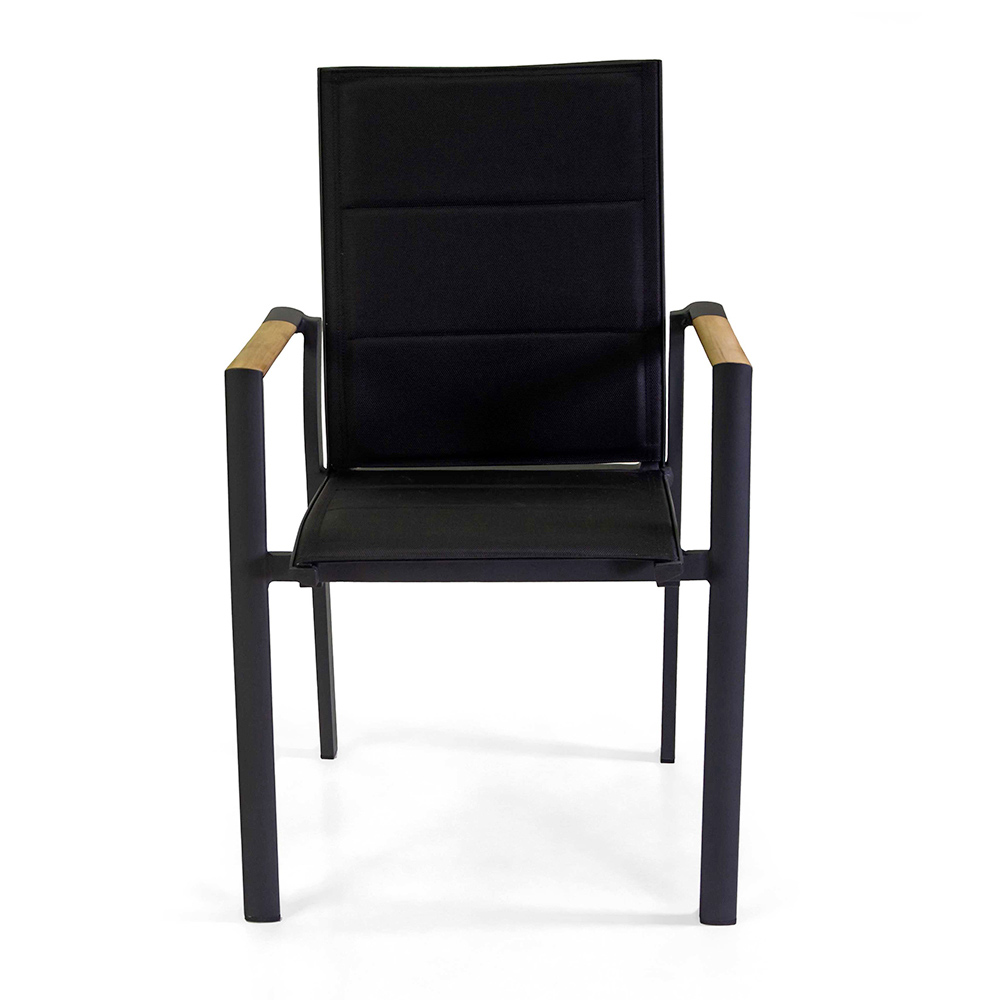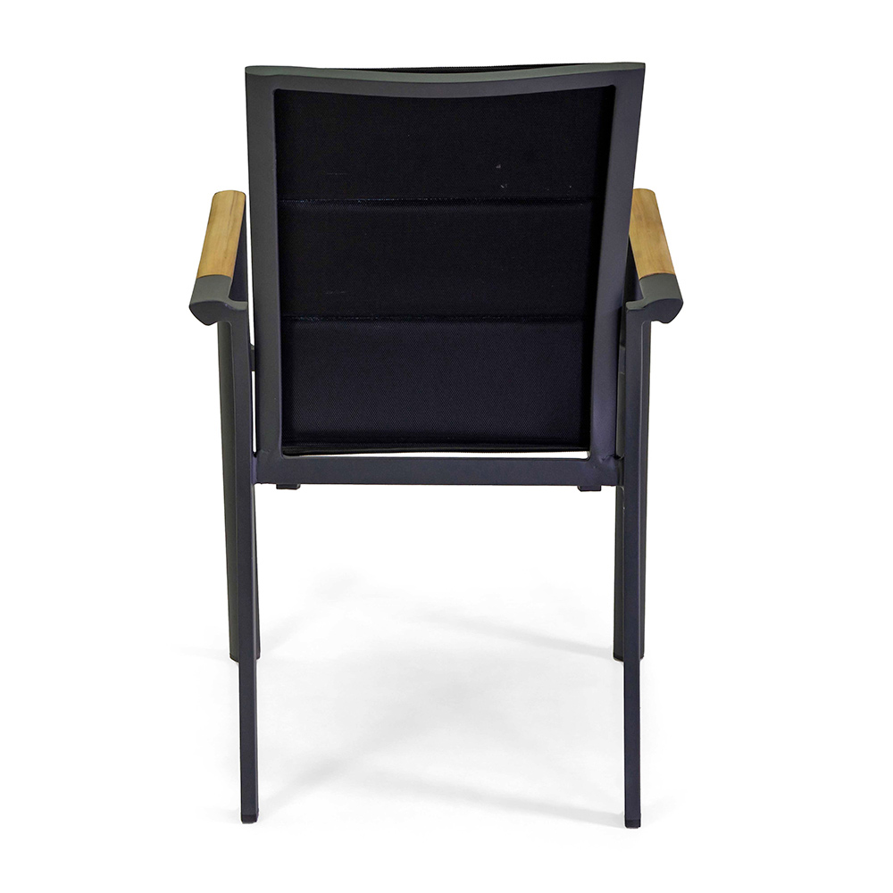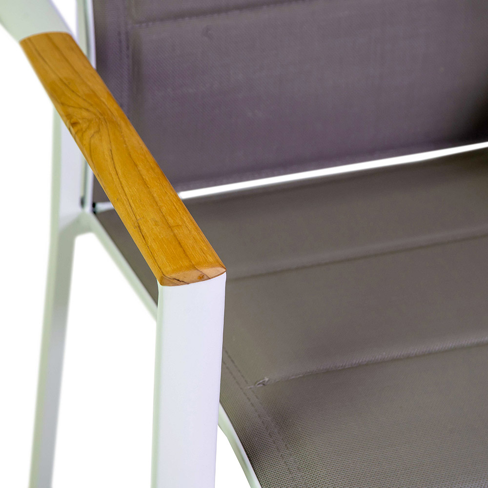 Teak hout accenten op de armleuningen voegen een vleugje natuurlijke warmte en verfijnde stijl toe, waardoor deze stoel perfect is voor zowel casual als elegante omgevingen.