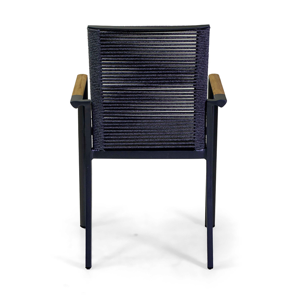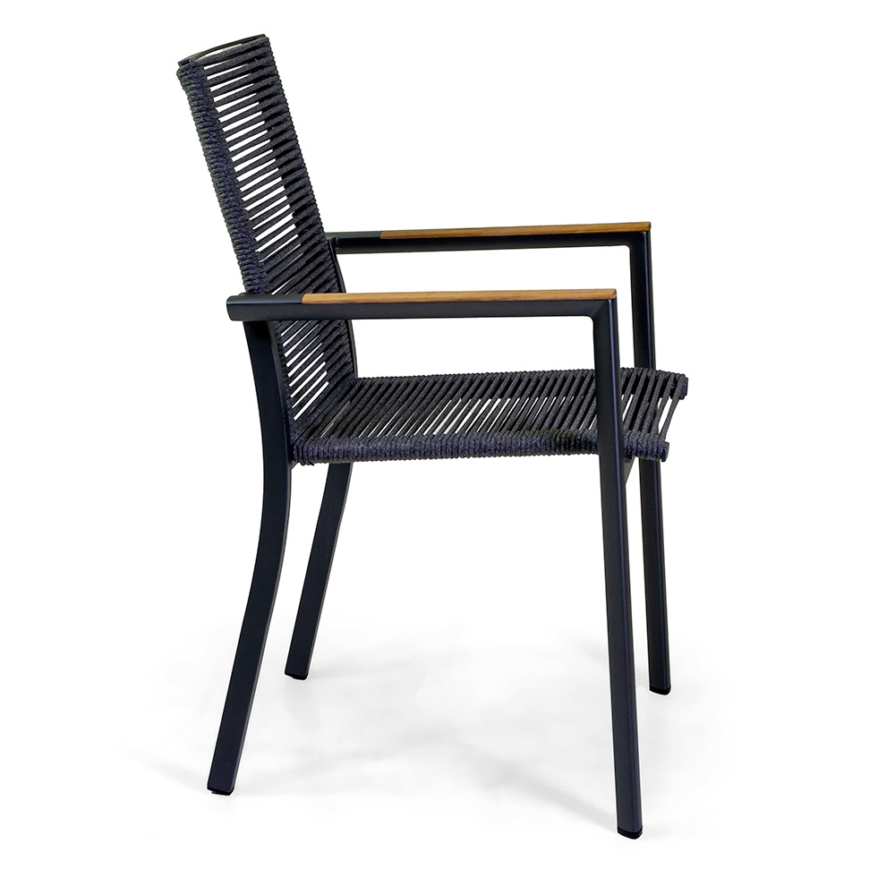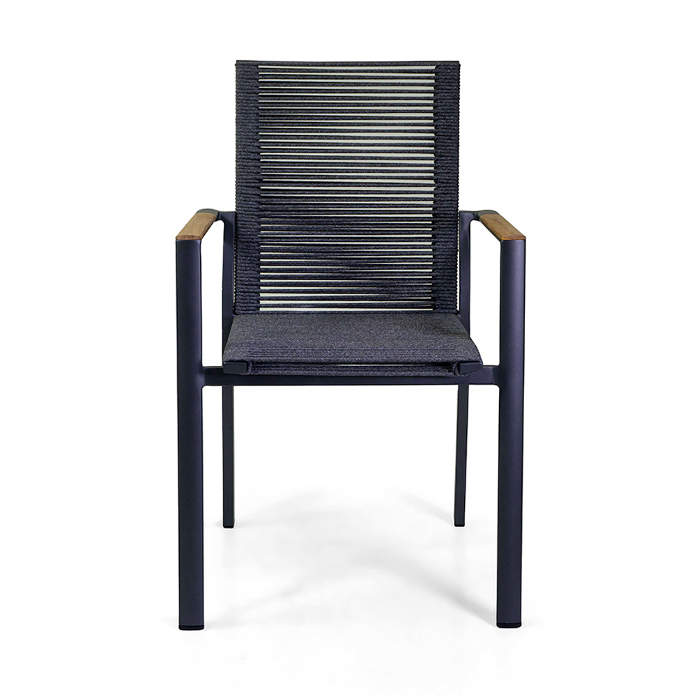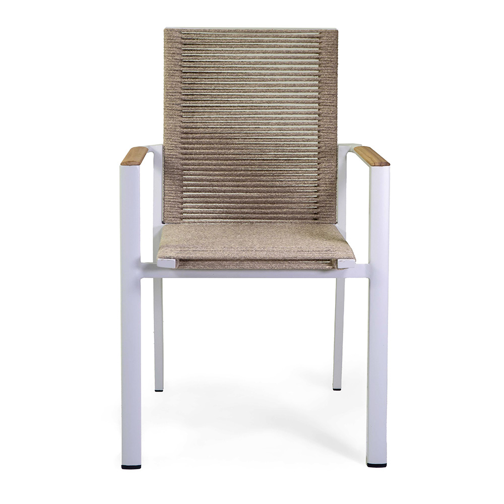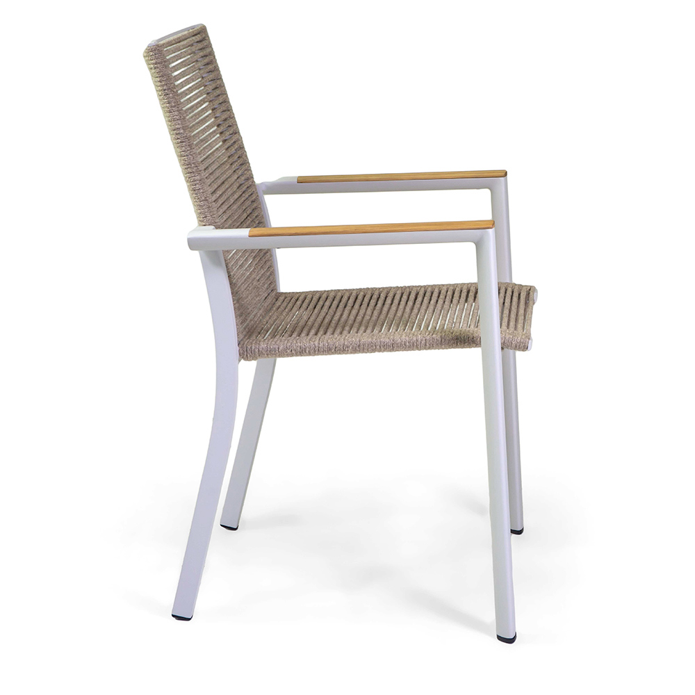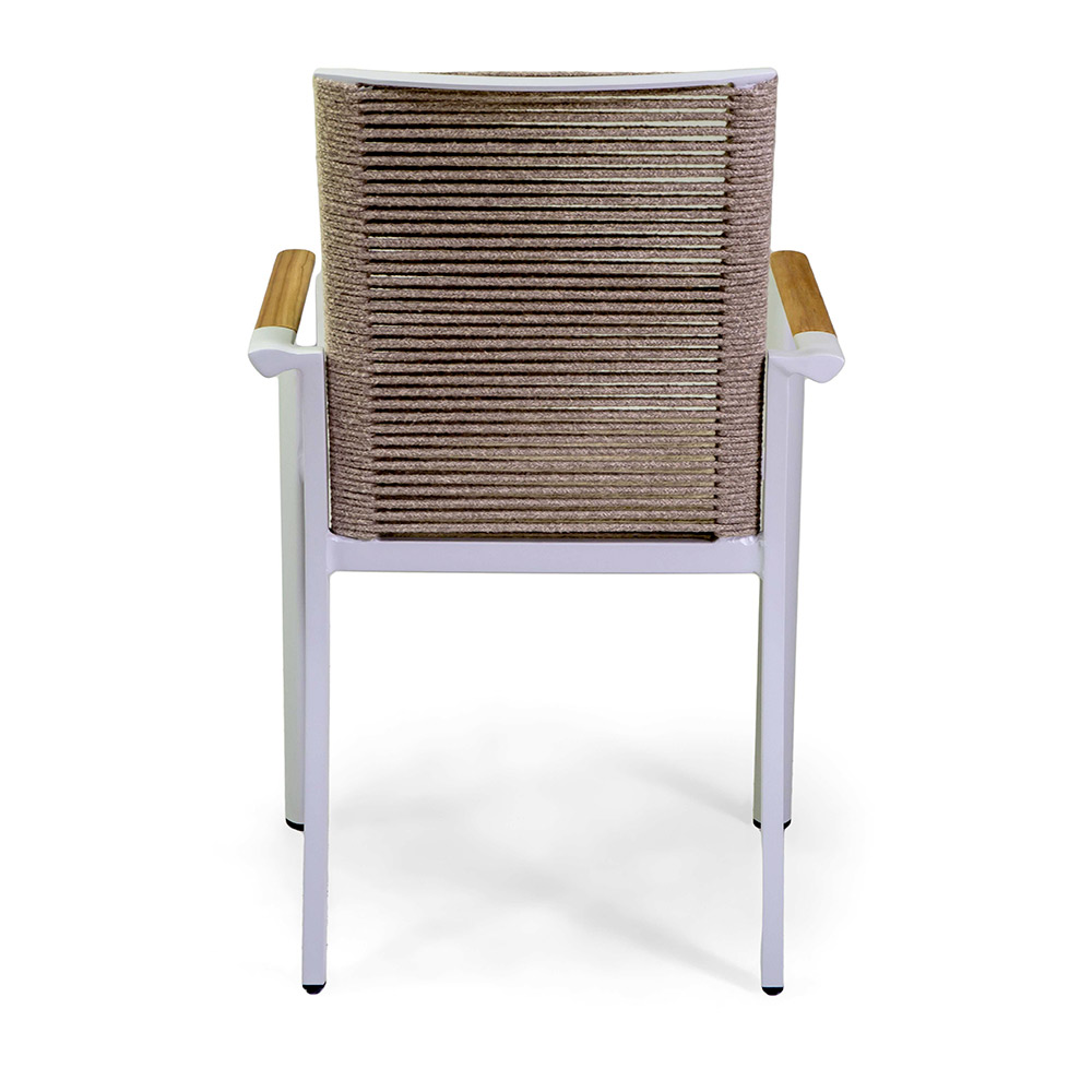Ontdek de moderne aantrekkingskracht en het comfort van onze buitenstoel . Met een strak, eigentijds ontwerp combineert deze stoel de sterkte van gepoedercoat aluminium met de natuurlijke schoonheid van touw. De houten armleuningen voegen een vleugje warmte en stijl toe.