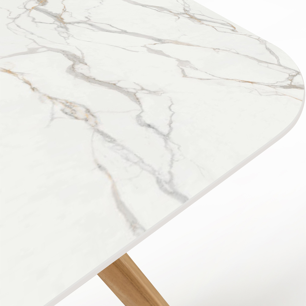 gemaakt in Italië. Deze buitentafel met een Calacatta Oro keramisch blad is een eerbetoon aan tijdloze elegantie en subtiele luxe. Hij combineert een warme en uitnodigende houten basis met een keramisch blad dat perfect past bij het Calacatta Oro marmer, bekend om zijn unieke gouden adering op een witte achtergrond.