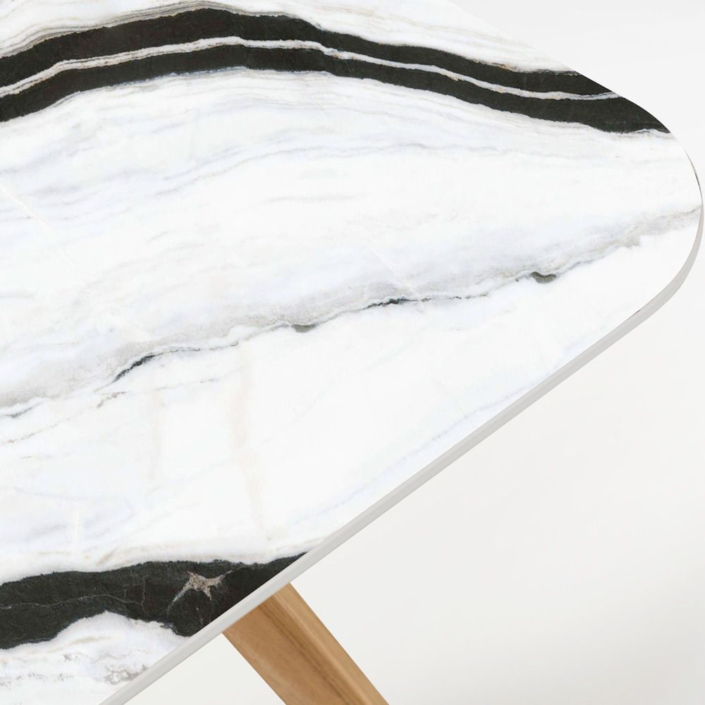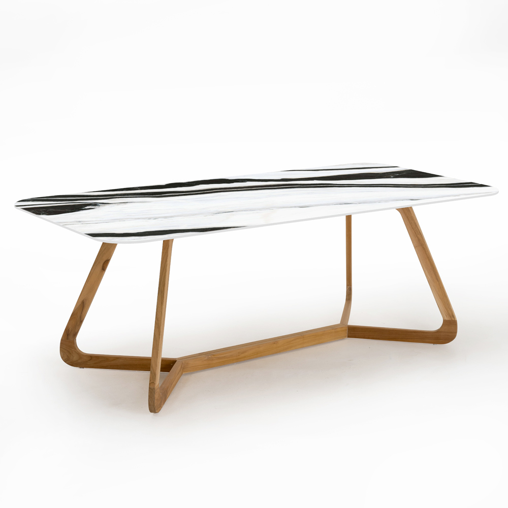 gemaakt in Italië. Deze buitentafel is een waar meesterwerk van design en combineert de warmte van hout met de elegante puurheid van Panda White keramiek. Dit opvallende tafelblad, met een opvallende zwarte nerf tegen een zuiverwitte achtergrond, is niet alleen een lust voor het oog, maar ook ongelooflijk duurzaam en onderhoudsvriendelijk, perfect voor elke buitenomgeving.
