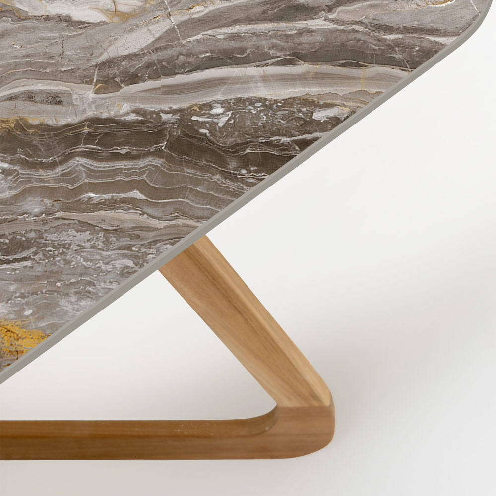 gemaakt in Italië. Deze buitentafel is een waar designwonder en combineert de kracht van hout met de weelde van keramiek, geïnspireerd op Orobico Luxe marmer . Dit keramische blad, met zijn grijstinten en glinsterende gouden aderen, weerspiegelt de schoonheid en complexiteit van natuurlijke rotsformaties en voegt een vleugje verfijnde luxe toe aan uw buitenruimte.