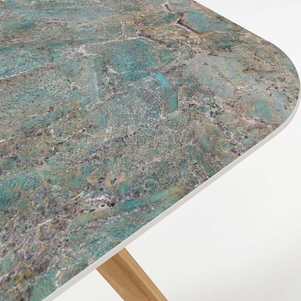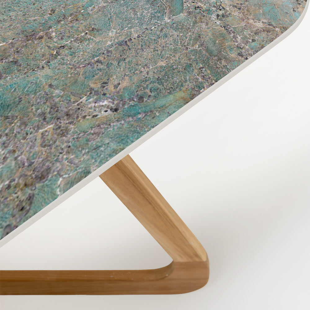 gemaakt in Italië. Deze exclusieve buitentafel is een waar designjuweel en combineert de elegantie van hout met de moderniteit van keramiek. Het tafelblad, vervaardigd van hoogwaardig keramiek met een prachtige antiekgroene tint, biedt uitzonderlijke weerbestendigheid en blijvende schoonheid.