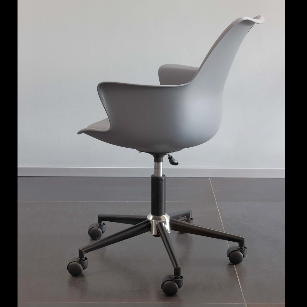 polypropyleen. Zachte en omhullende lijnen kenmerken de zitting van deze stoel, die comfort en gemak wil bieden. Dankzij de mogelijkheid om de hoogte aan te passen en de zwenkwielen is het mogelijk om hem aan te passen aan de verschillende behoeften van de persoon, zodat hij voor iedereen een comfortabele en functionele stoel wordt.