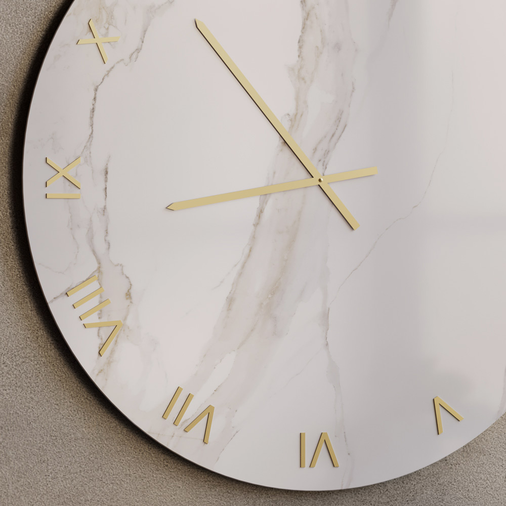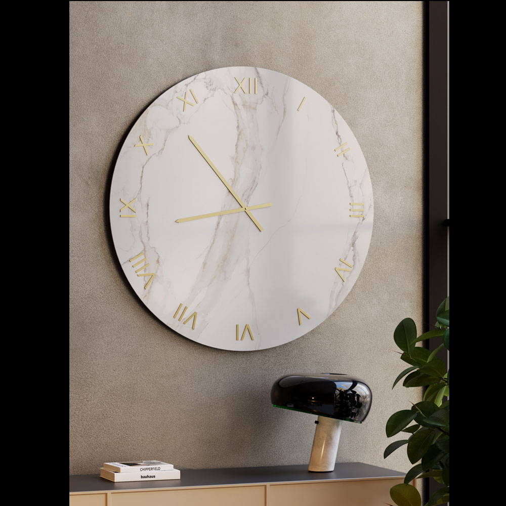 De glazen wandklok met een gezeefdrukte Calacatta marmerlook is een verfijnd meubelstuk, ontworpen om moderne en eigentijdse ruimtes te verfraaien met een vleugje tijdloze luxe. Het glazen oppervlak accentueert de delicate adering, geïnspireerd op natuurlijk marmer, waardoor een elegant samenspel van licht en diepte ontstaat.