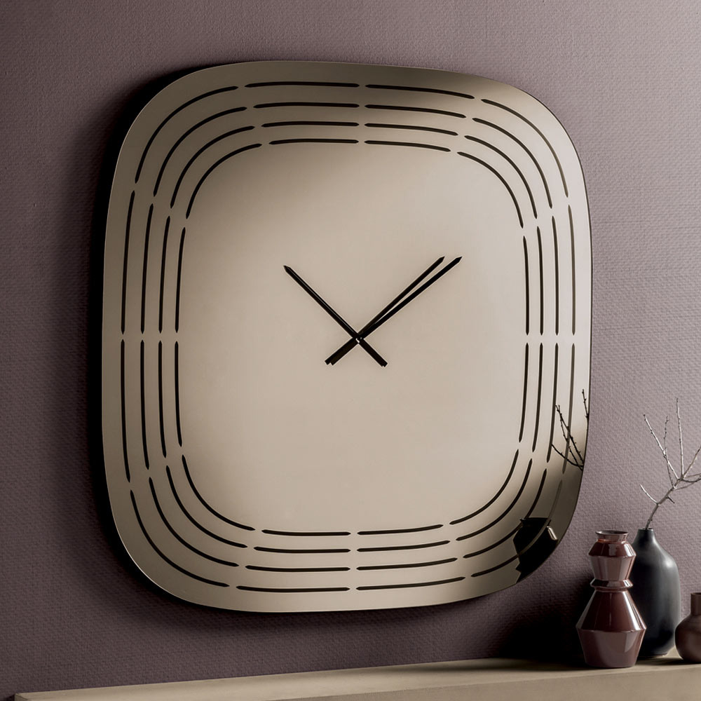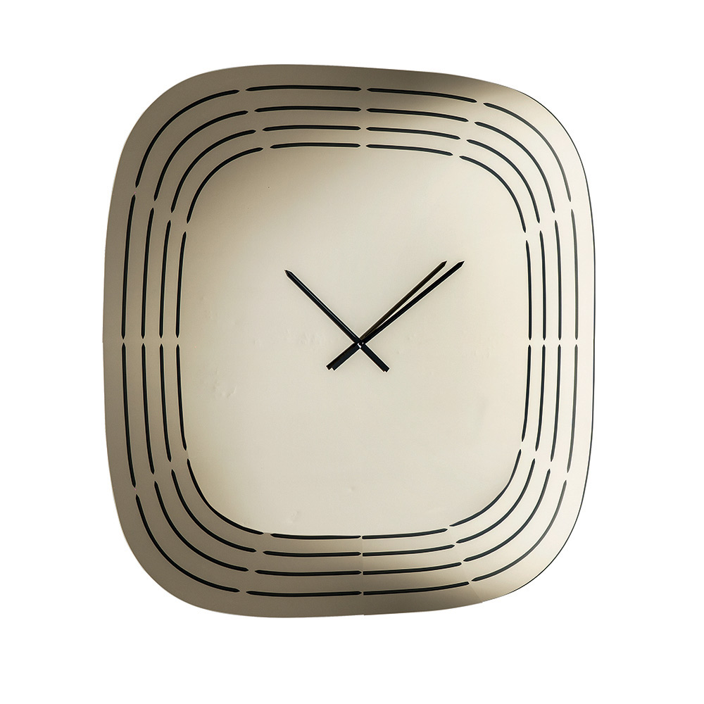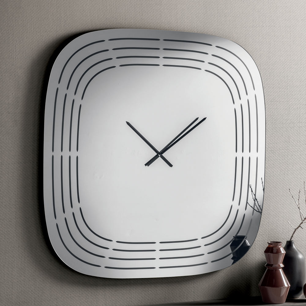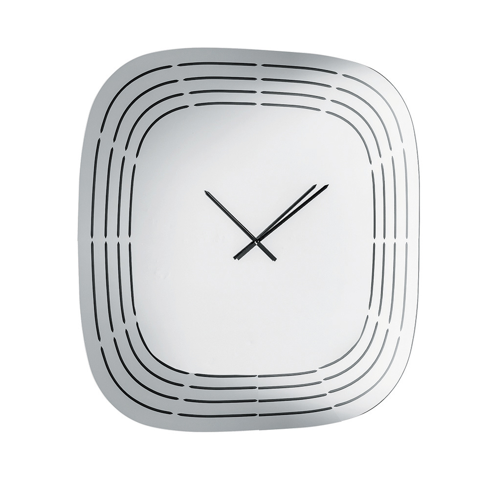 De klok is vervaardigd uit spiegelglas en heeft een vierkante vorm met afgeronde hoeken die het uiterlijk verzachten, waardoor de klok visueel evenwichtig en modern oogt. Het oppervlak is verfraaid met lasergegraveerde concentrische lijnen die de contouren van de klok volgen, met ruimte in het midden voor de wijzers, wat een verfijnd grafisch effect creëert.