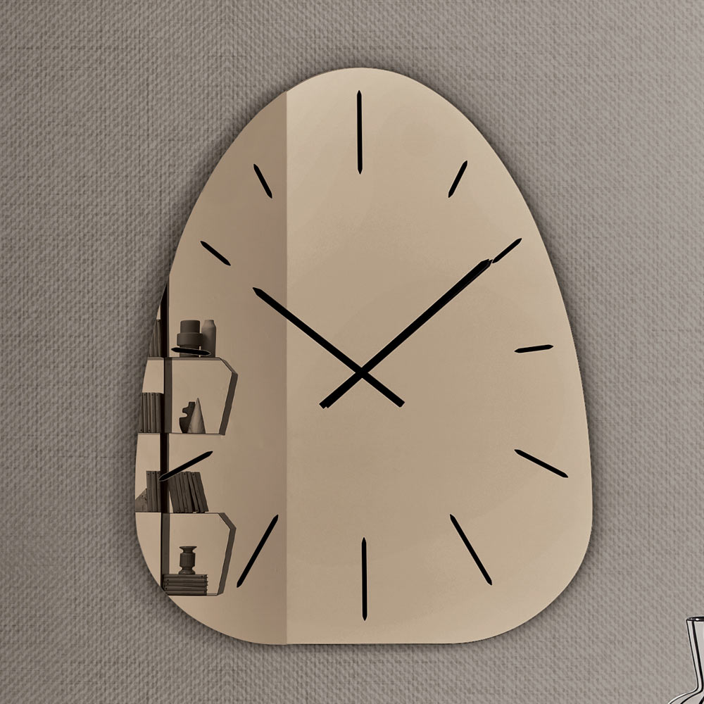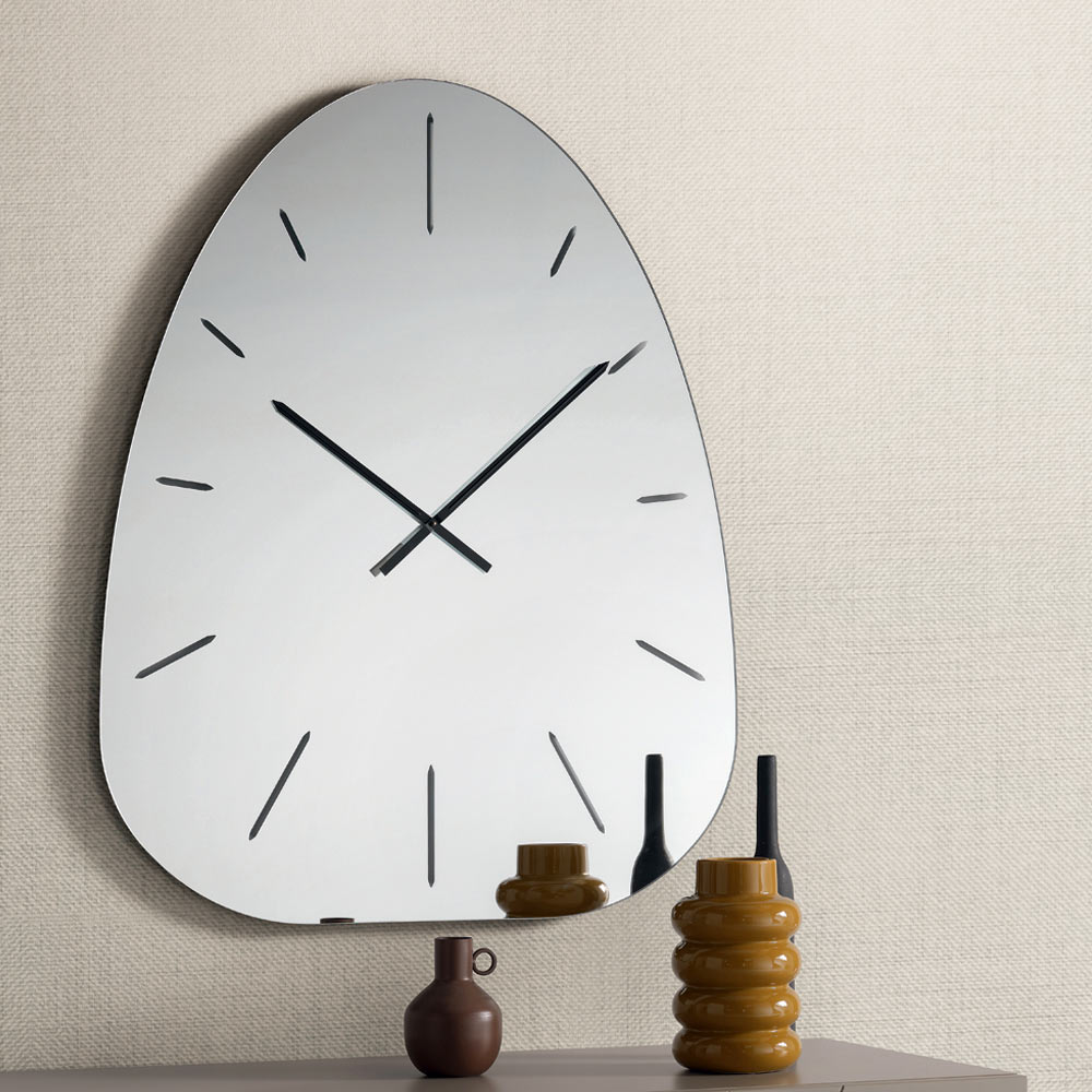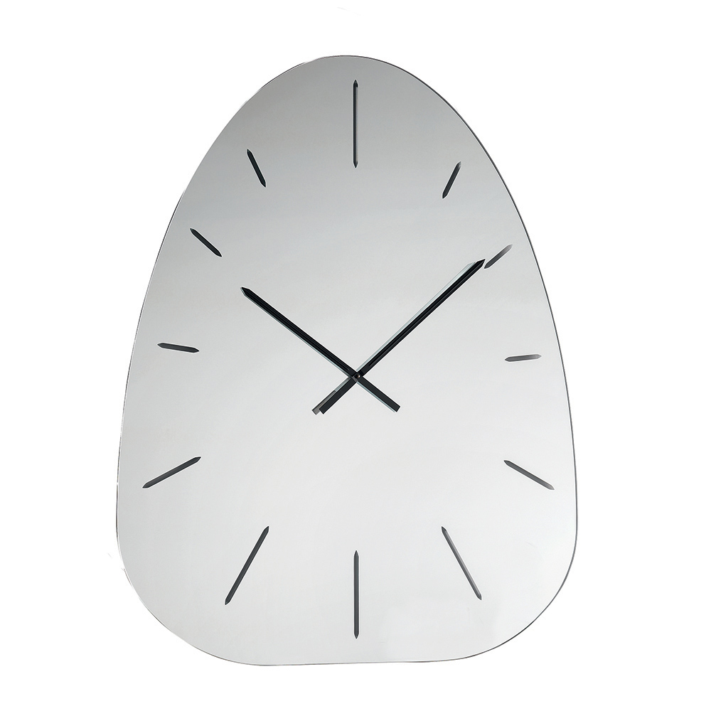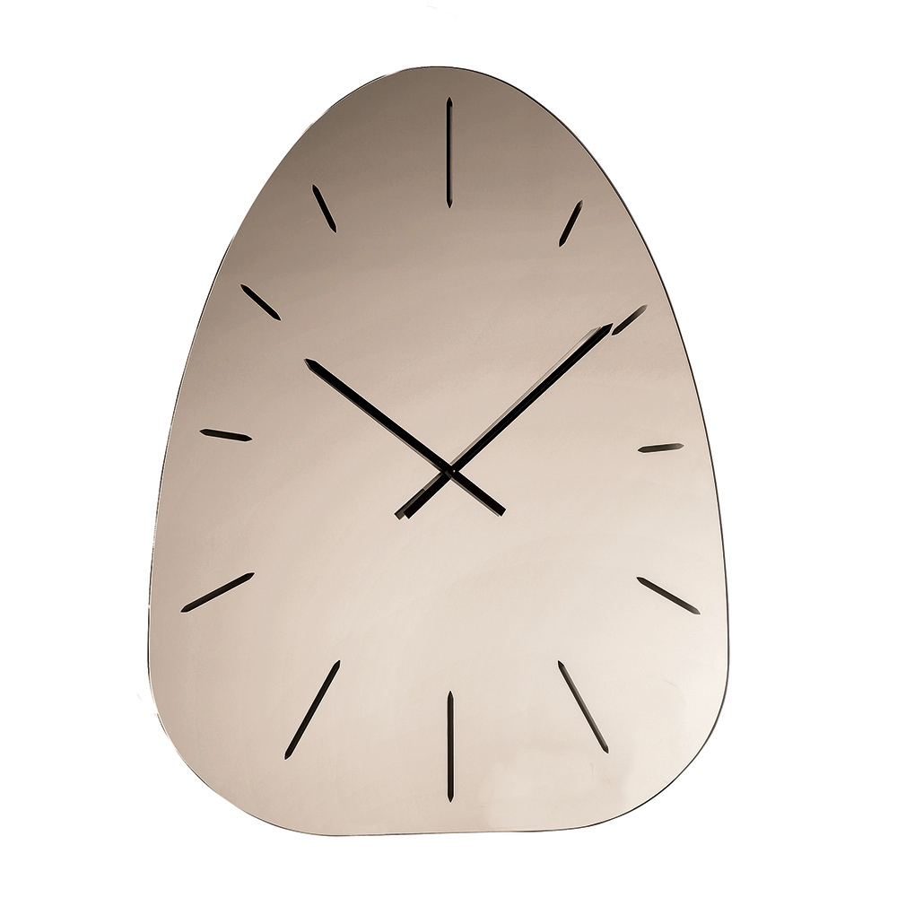Het horloge is gemaakt van spiegelend glas en valt op door de lasergegraveerde cijfers die subtiel uit het reflecterende oppervlak tevoorschijn komen, waardoor een verfijnd spel van licht en diepte ontstaat dat gedurende de dag varieert.