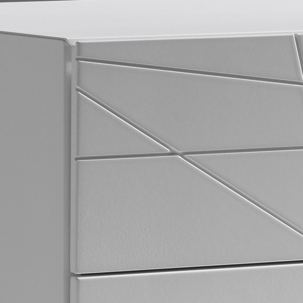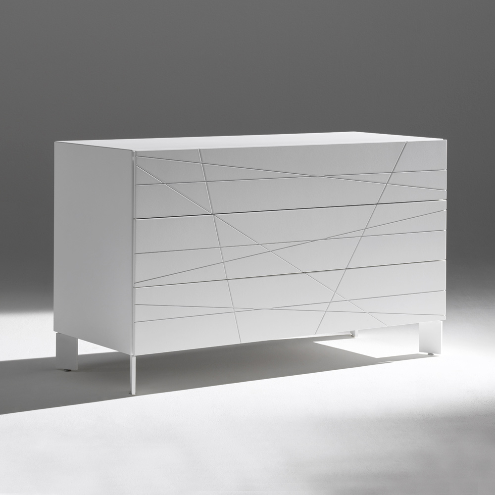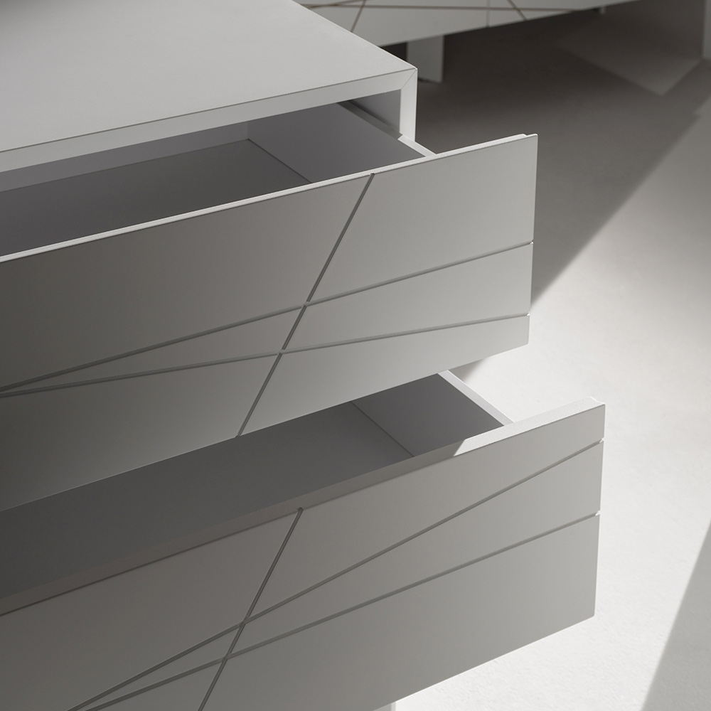 Een dressoir met een eigentijds, strak design, gekenmerkt door een sterke grafische identiteit en heldere lijnen. De geometrische vormen op de fronten creëren een elegant samenspel van lijnen dat met het licht interacteert, waardoor het meubelstuk een ware blikvanger in de slaapkamer wordt.