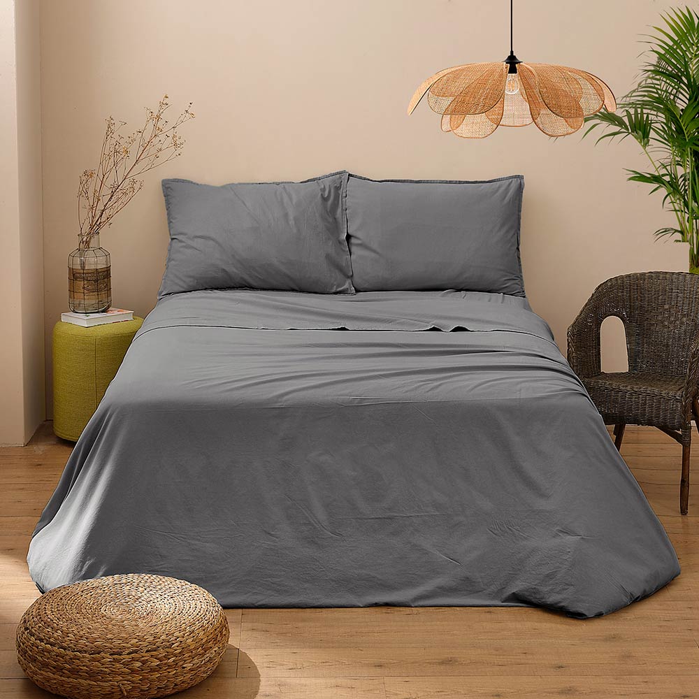 garment-dyed pure katoenen tweepersoonsbedset . De zachte en ademende textuur van het katoen zorgt voor ongeëvenaard comfort, terwijl de garment-dyeing techniek een rijke en langdurige kleur geeft die wasbeurt na wasbeurt meegaat. Perfect voor degenen die stijl en functionaliteit willen combineren, deze set bevat boven- en onderlakens en bijpassende kussenslopen, allemaal ontworpen om u maximaal comfort te bieden en een vleugje verfijning toe te voegen aan uw kamer.