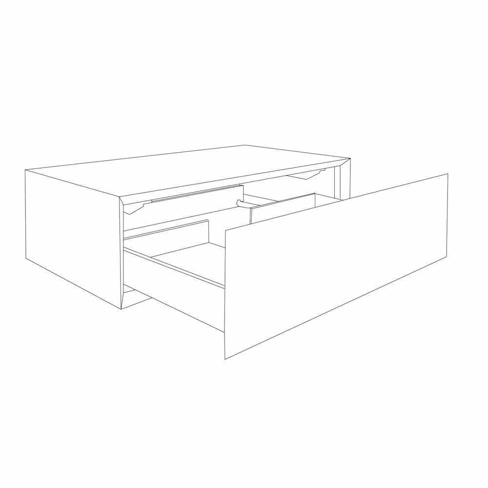 blad in natuurlijke acrylsteen - Hi Macs® met massief teakhouten lade, druk-/treksluiting en aanleg voor centrale afvoer. Geleverd met beugels en muurbevestigingsschroeven. Het gat voor de kraan kan eenvoudig "ter plaatse" worden gemaakt met een normale boor.