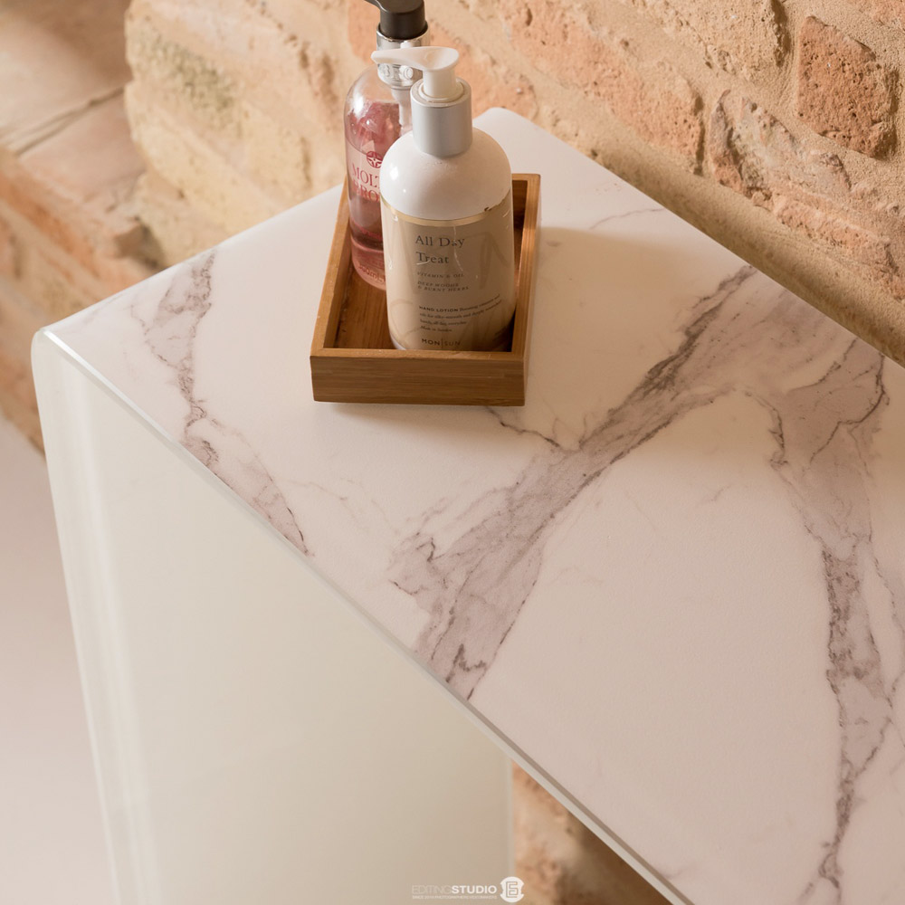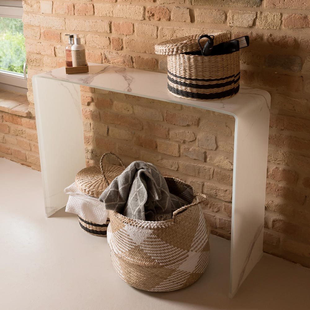 Deze elegante, eigentijdse consoletafel is vervaardigd uit 10 mm gebogen gehard glas met een verfijnde marmerlook afwerking , wat een vleugje elegantie en licht aan de ruimte toevoegt. De monolithische structuur versterkt de minimalistische esthetiek van het product.
