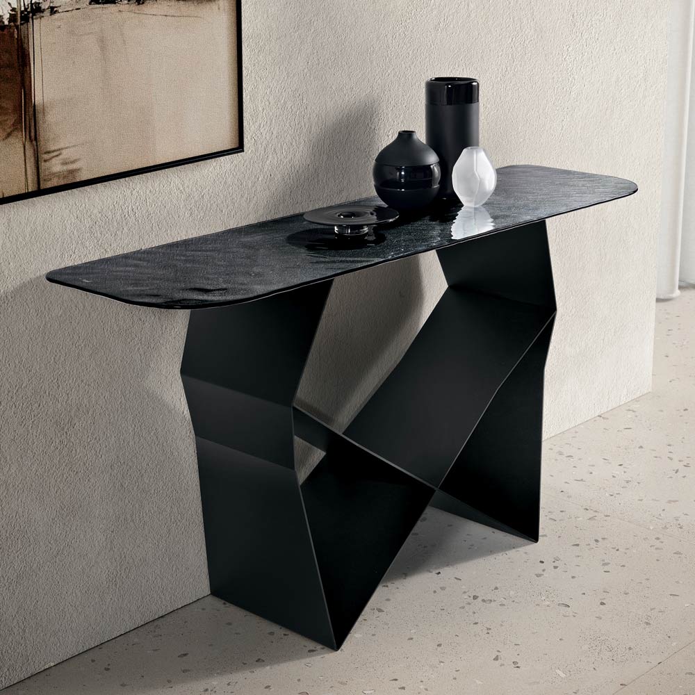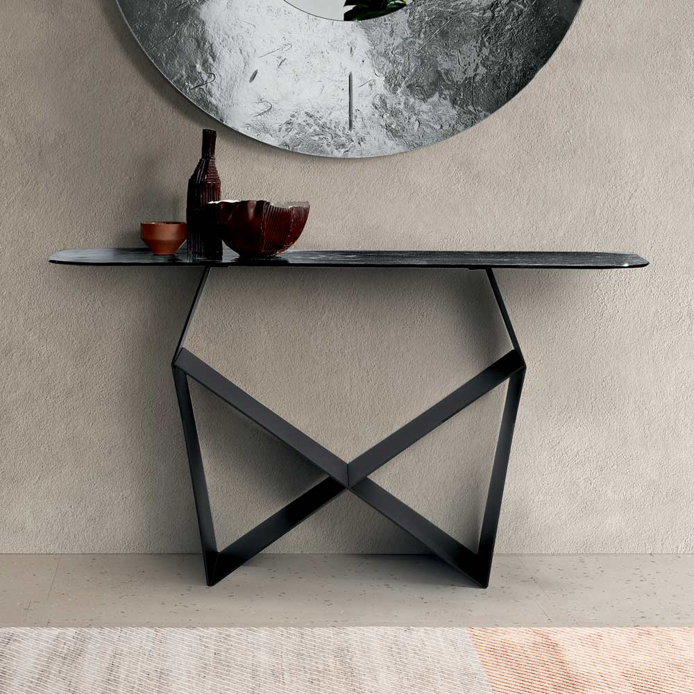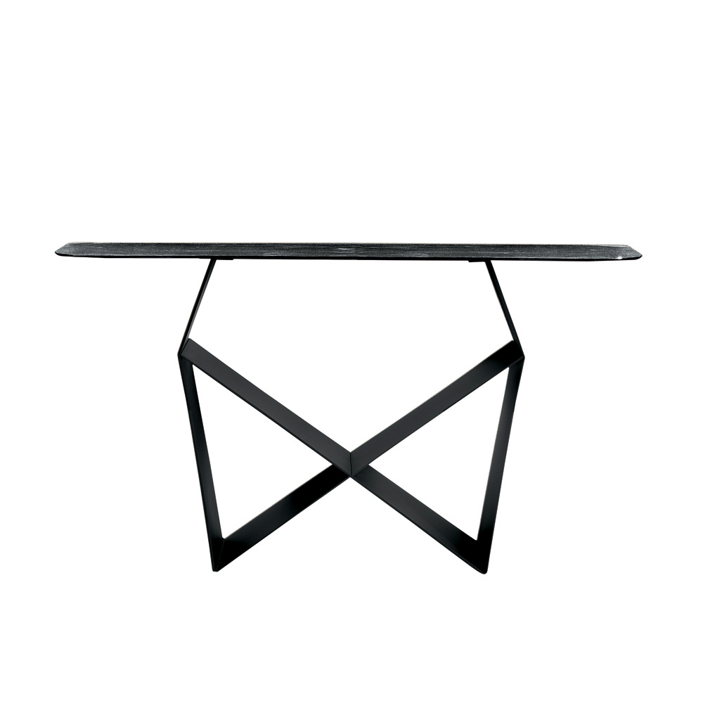 De structuur valt op door de geschilderde metalen voet die een originele vlinderdasvorm creëert, waardoor een verfijnd samenspel van massieve en open vlakken ontstaat. Dit detail verleent dynamiek en vaart aan het geheel, waardoor de console een dramatische maar evenwichtige uitstraling krijgt.