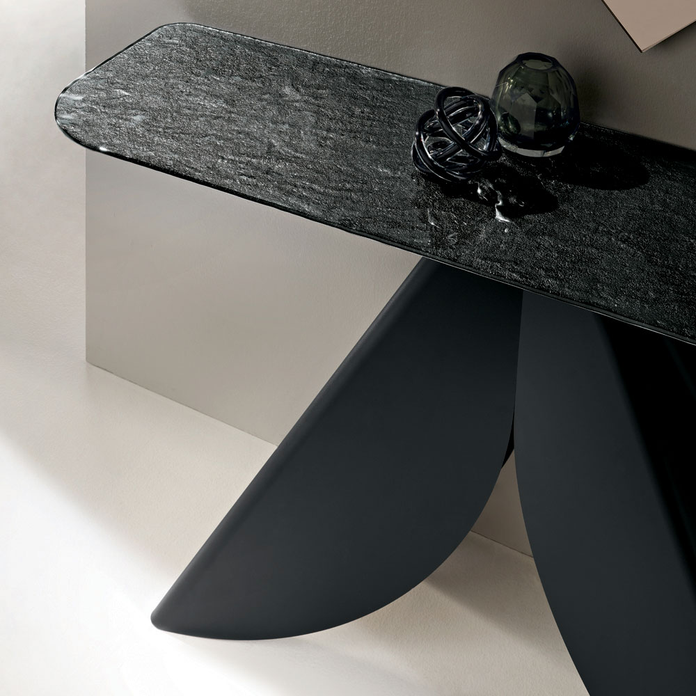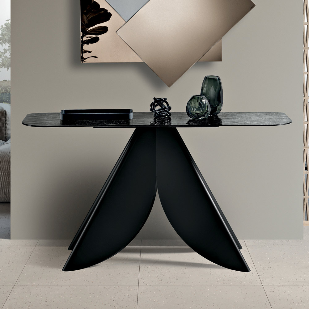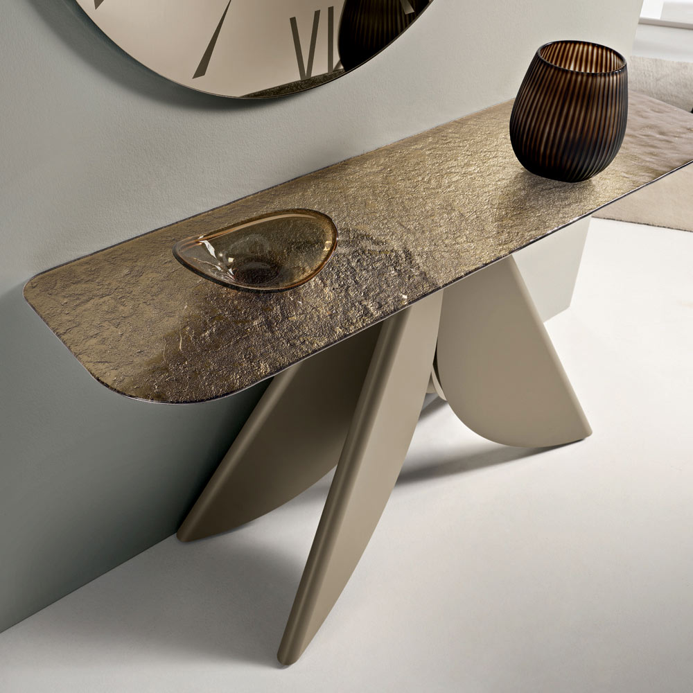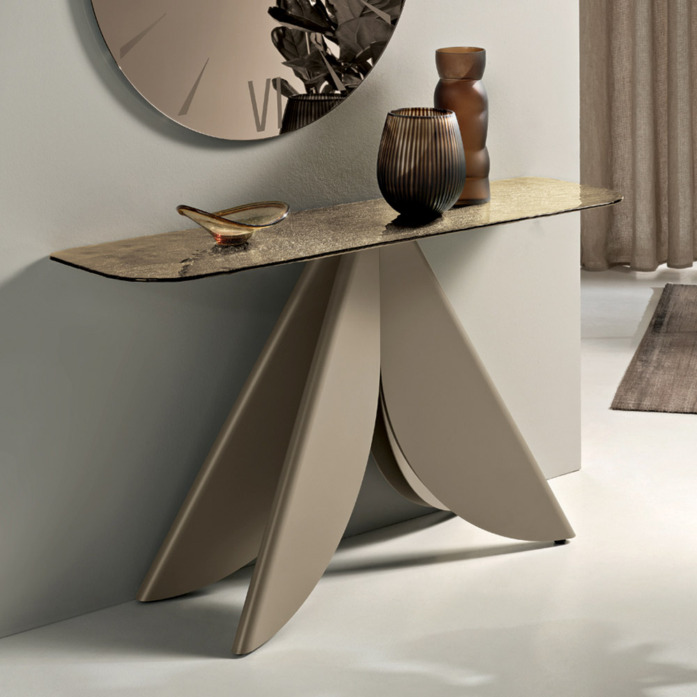 Een elegante, in Italië vervaardigde designconsoletafel , ideaal voor een stijlvolle inrichting van de entree , woonkamer of gangen. Het eigentijdse ontwerp combineert visuele lichtheid met een sterke esthetiek, waardoor een functioneel element een waar decoratief element wordt.