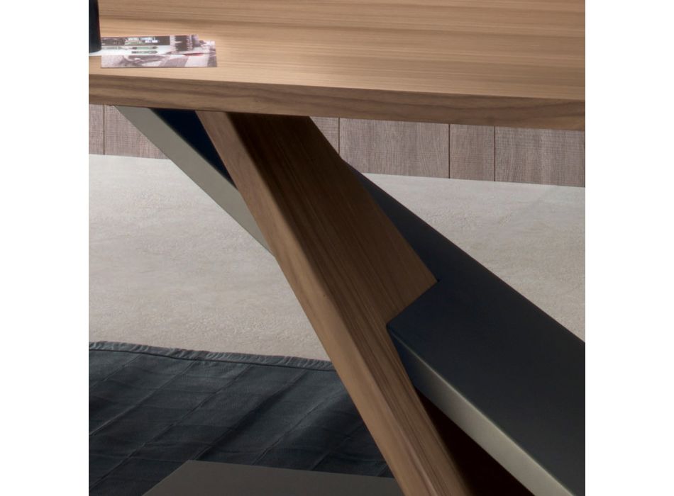 Dit eettafel een poedercoating metalen voetmet centraal inzetstuk in gelakt hout en een bovenblad canaletto noten gefineerd. De eigenaardigheid wordt gegeven door de onmiskenbare zeta-vorm van de tafelstructuur die de aanvulling verbindt met de omgeving waarin deze wordt geplaatst. Het resultaat is dus een grote verfijning in stijl en design.