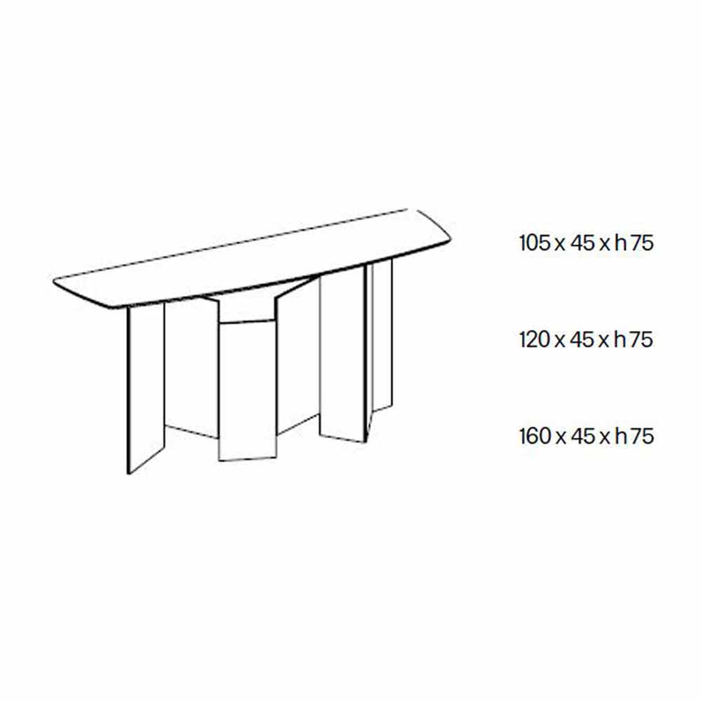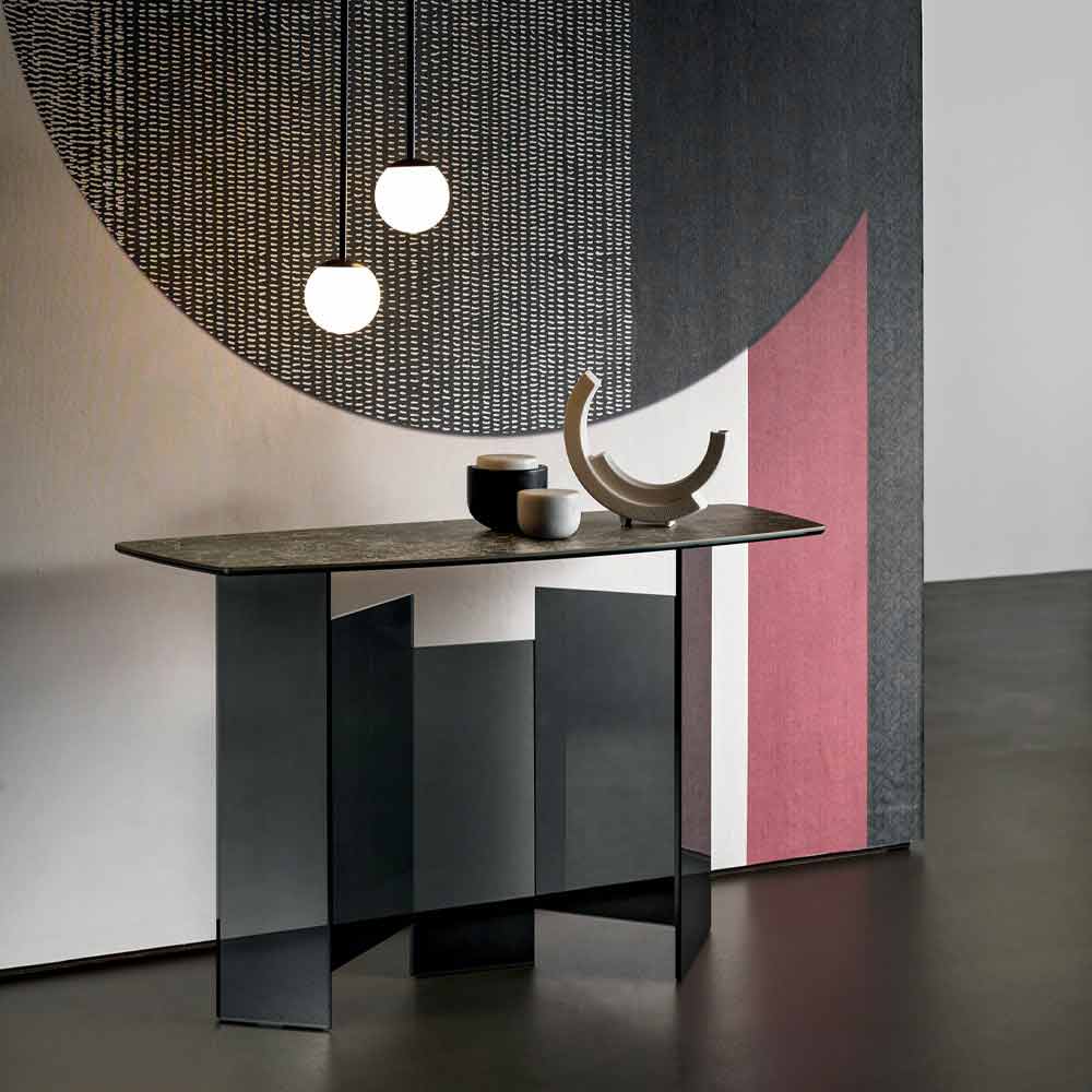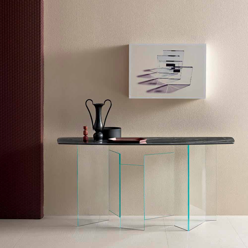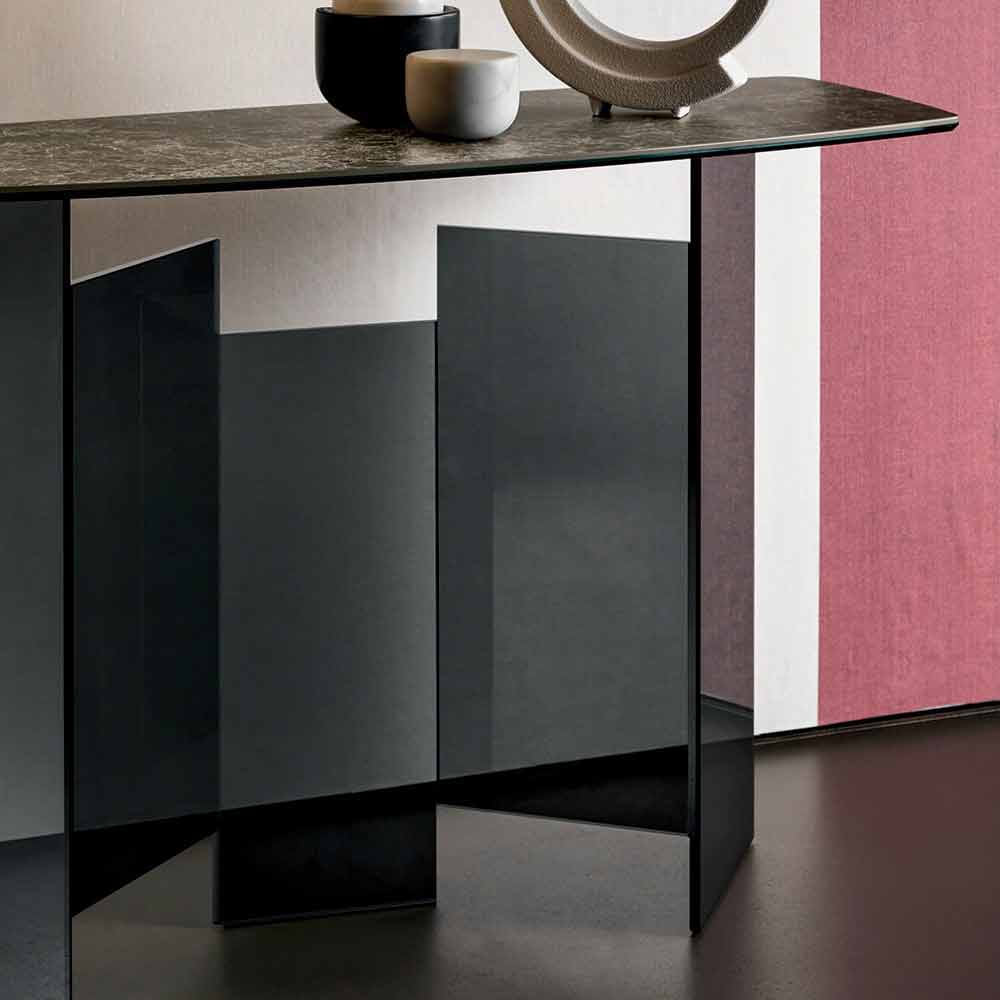 Moderne woonkamerconsole met Emperador of Noir Desir keramiek blad en glazen voet, met de hand gerealiseerd in Italië.