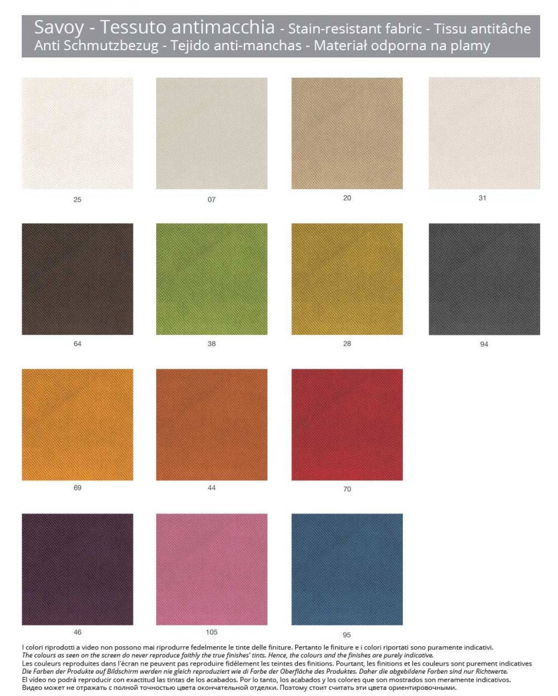 - Savoy vlekbestendige stof ; Savoy is een stof met een modern design, aangenaam om aan te raken en zeer slijtvast en slijtvast. Het belangrijkste kenmerk van deze stof is de totale ondoordringbaarheid voor water: het is in feite gatantito als "waterafstotend". 89% polyester, 8% polyamide, 2% katoen, 1% viscose.