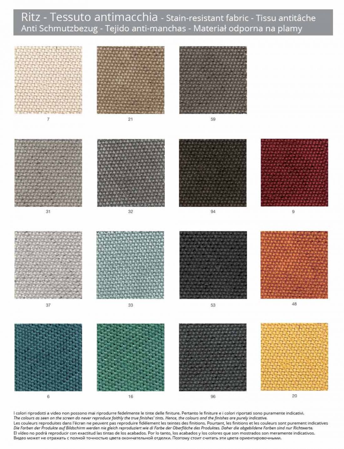 - Ritz anti-vlekken stof ; Ritz is een aangename stof om aan te raken, geselecteerd als bekleding voor deze stoelen dankzij de karakteristieke slijtvastheid. Het is een anti-vlekstof bestaande uit 86% polyester, 14% polyamide. Gewicht / dikte 490 gr / mtl.