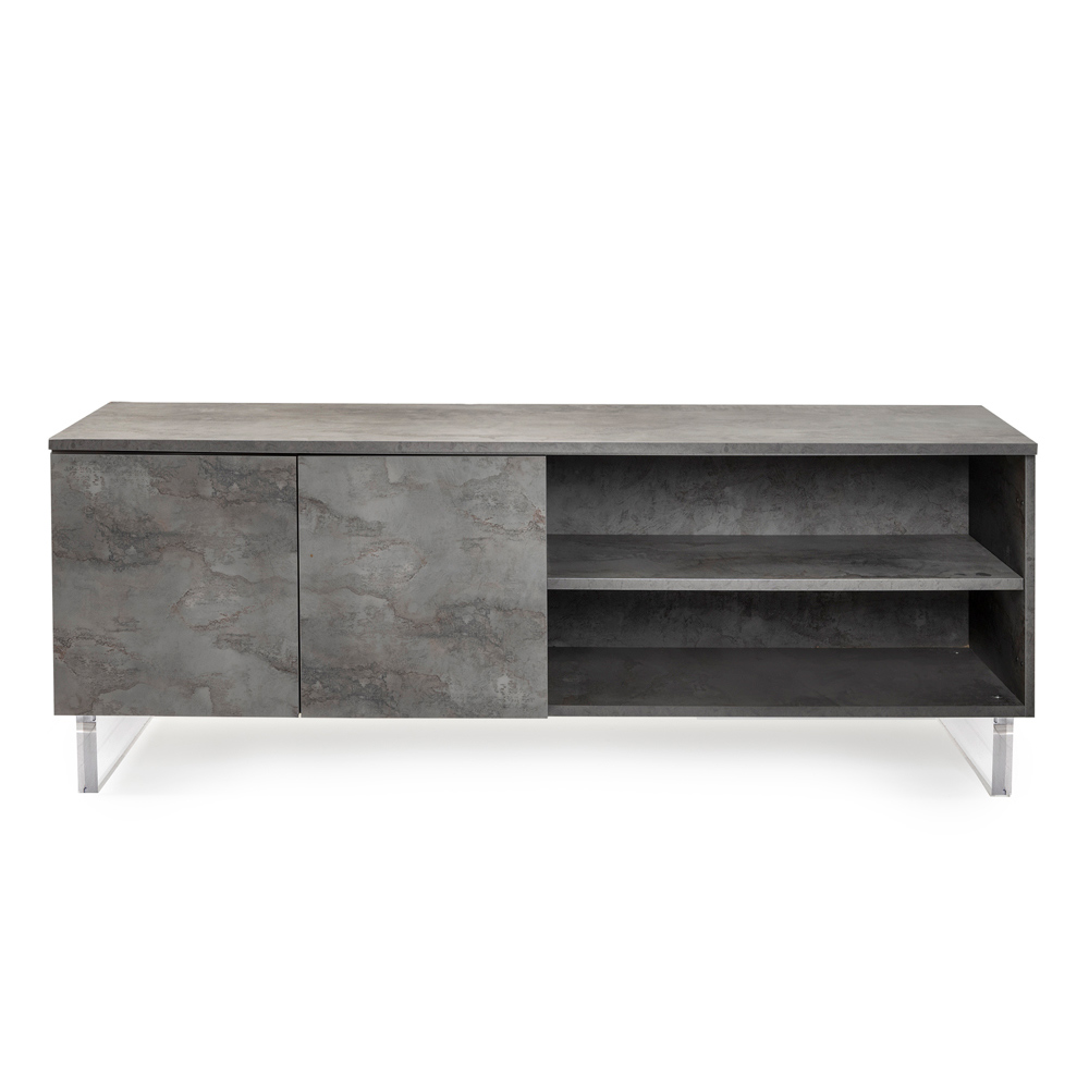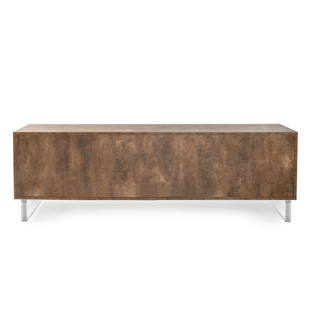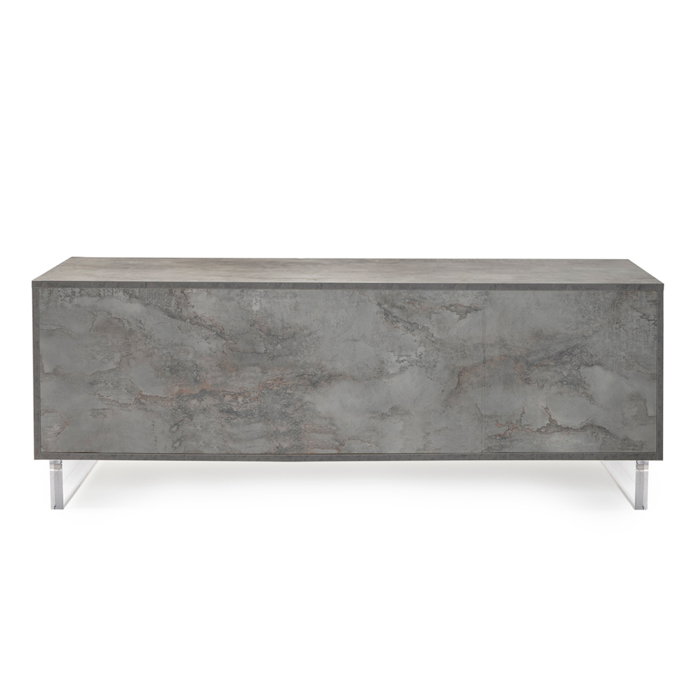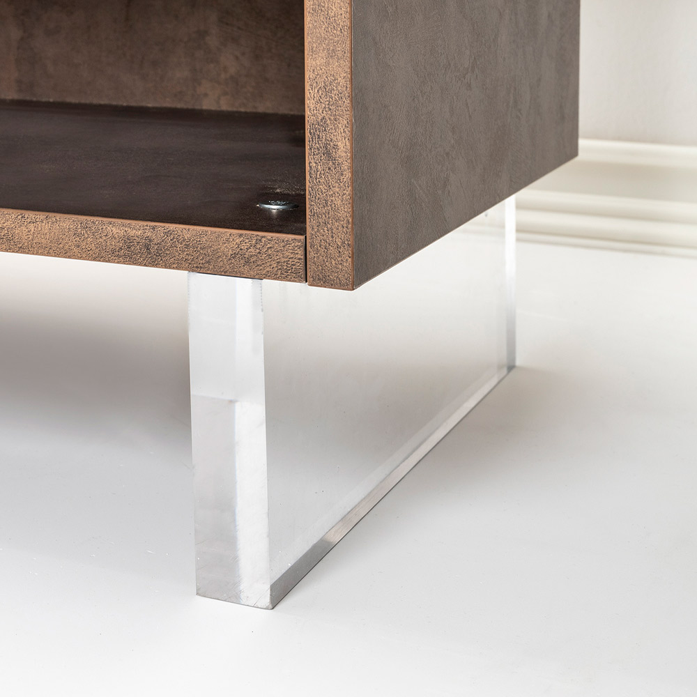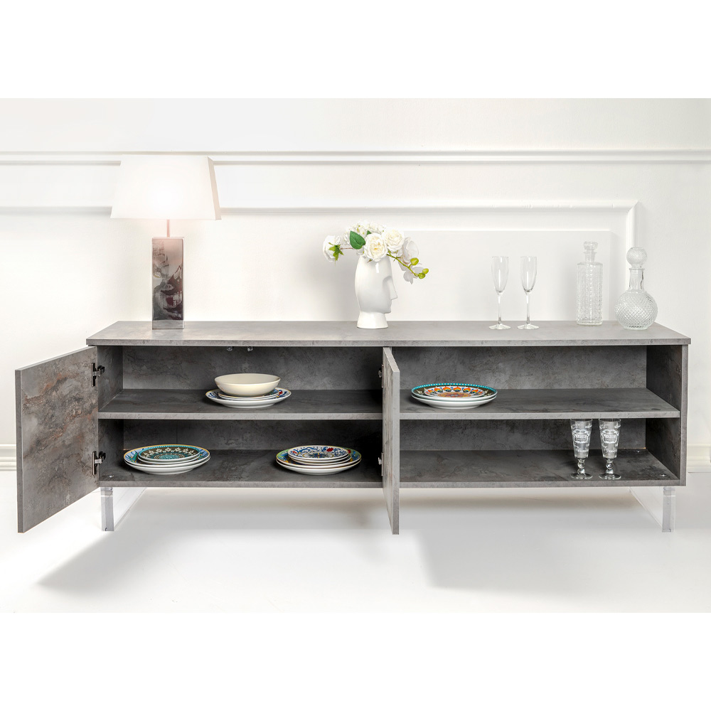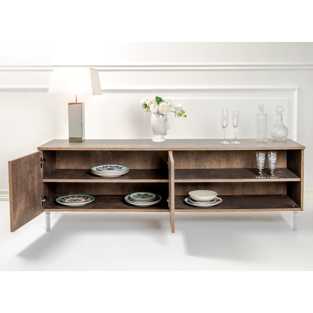 Het dressoir, met zijn plexiglas poten, lijkt de grond te raken, een designdetail dat een vleugje moderniteit en lichtheid toevoegt. Binnen wachten nette planken met ruimte voor alles waar je van houdt, van boeken tot alledaagse spullen, en bieden zo een elegante oplossing voor de behoefte aan organisatie.