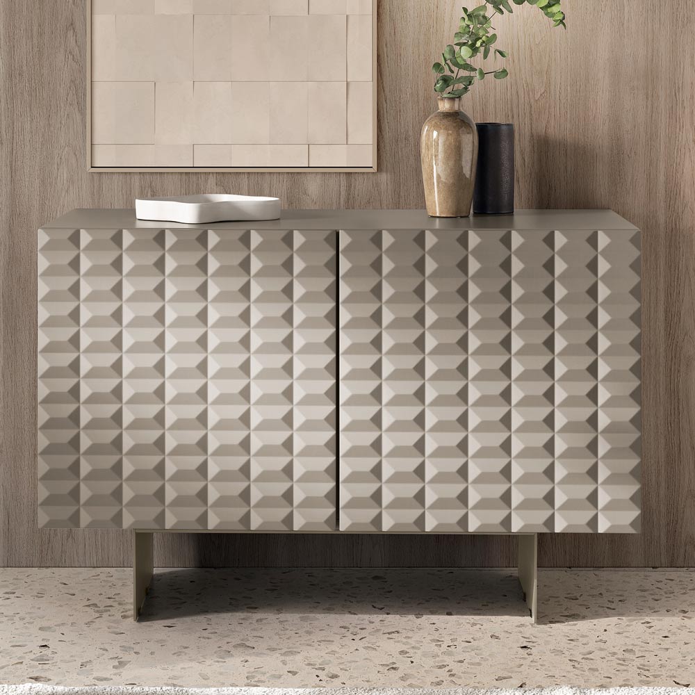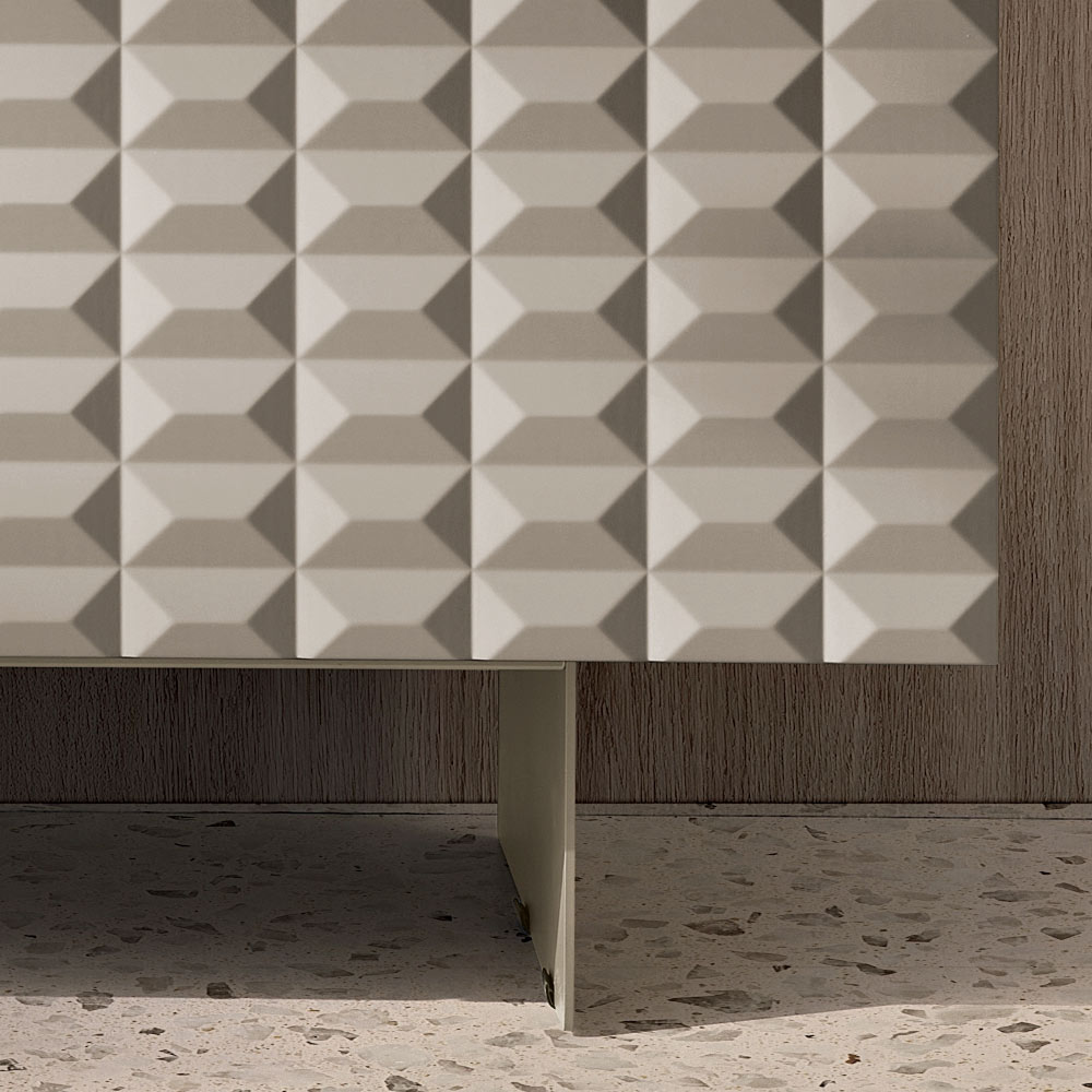 De met PVC gecoate MDF-deuren hebben een driedimensionale geometrische textuur die doet denken aan de beroemde diamantvormige reliëfs, waardoor een fascinerend spel van licht en schaduw ontstaat. Dit detail voegt visuele diepte toe en maakt het dressoir tot een ware blikvanger in de kamer.