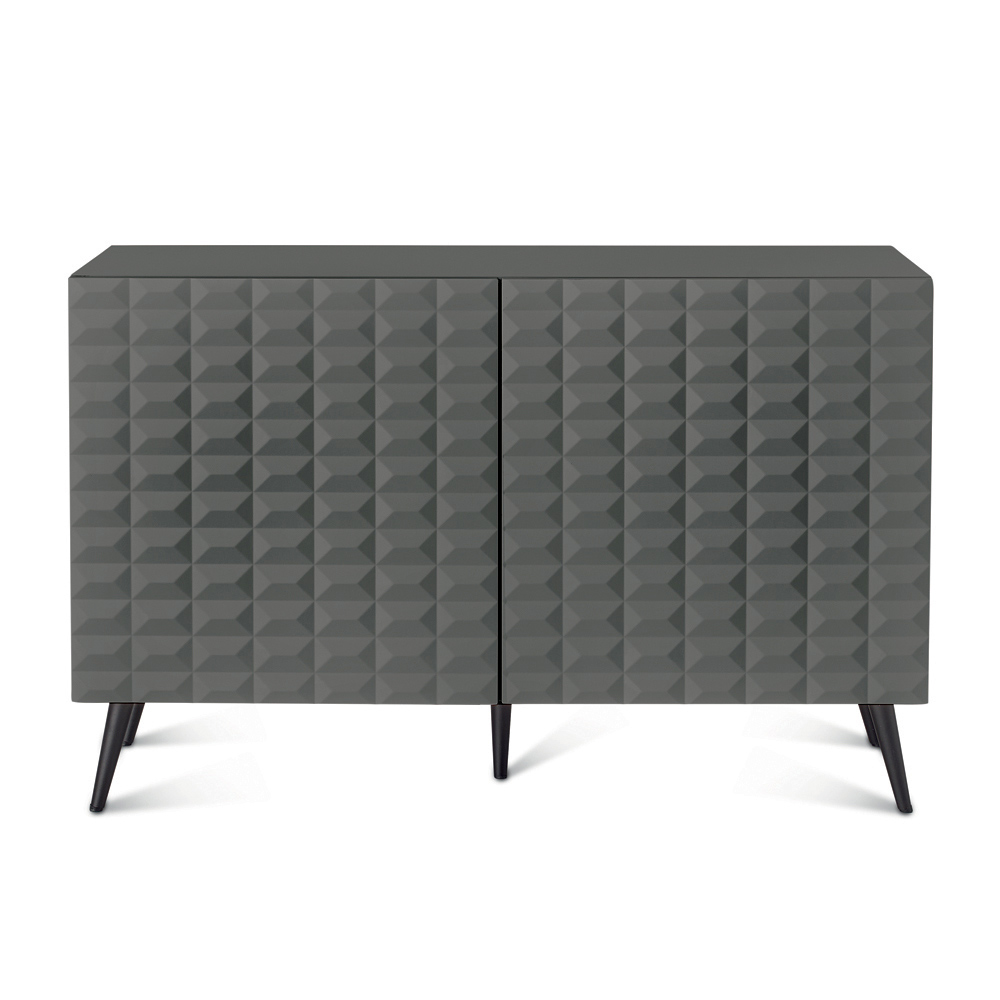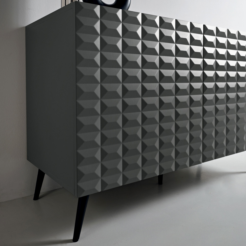 Design dressoir, vervaardigd in Italië, met driedimensionale ruitvormige deuren en metalen onderstel.