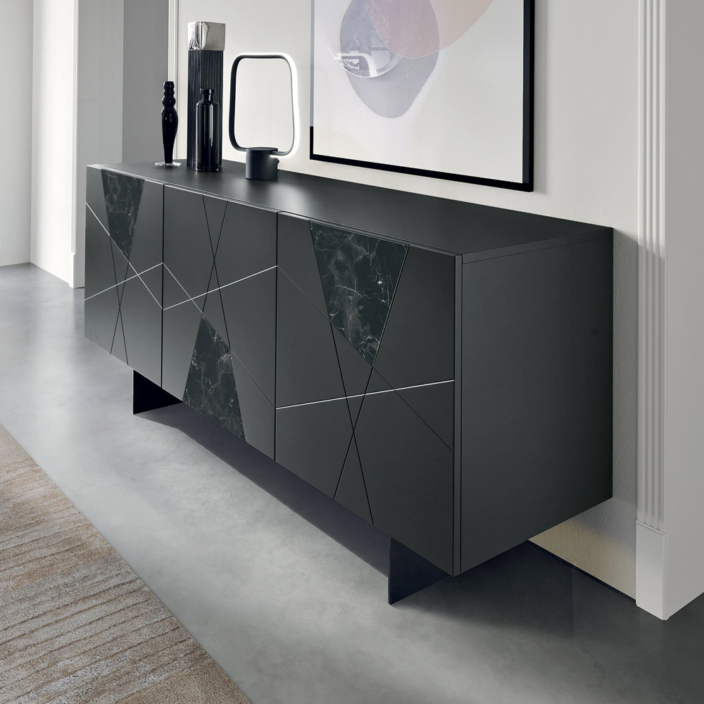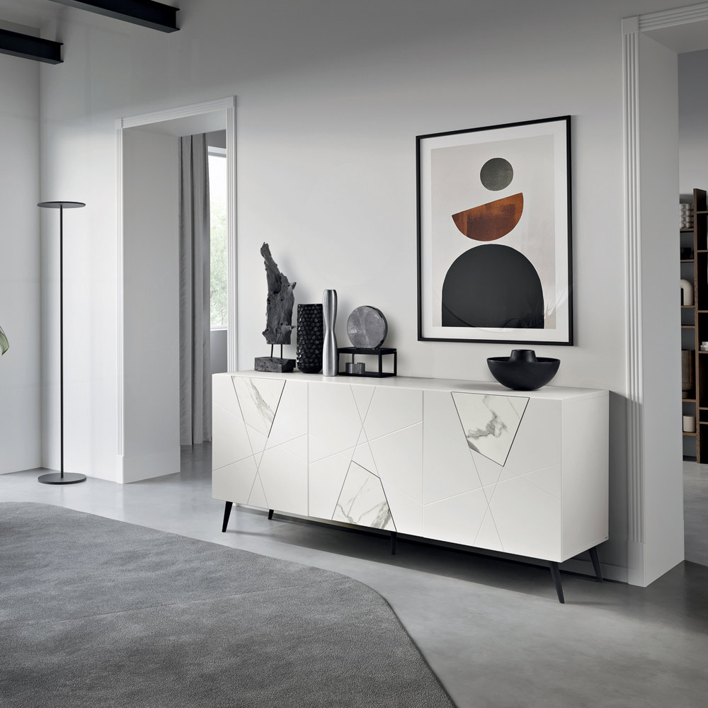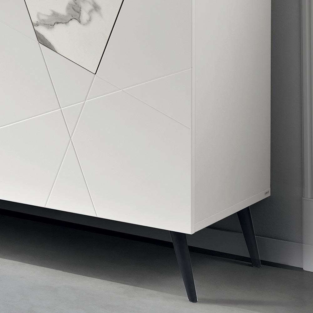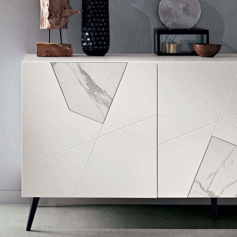De constructie bestaat uit een frame van met melamine bekleed hout en gepantografeerde MDF-deuren met decoratieve gravures die elkaar kruisen in een elegant geometrisch patroon. De glasinzetten met marmerlook verrijken het oppervlak en creëren een verfijnd samenspel van grafische elementen en materialen.