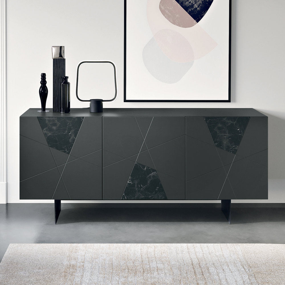 De beschikbare afwerkingen geven het geheel een evenwichtige en elegante uitstraling, waardoor het dressoir perfect is voor moderne en stijlvolle interieurs. De lichte verhoging van de voet zorgt voor stabiliteit en een eigentijdse look.