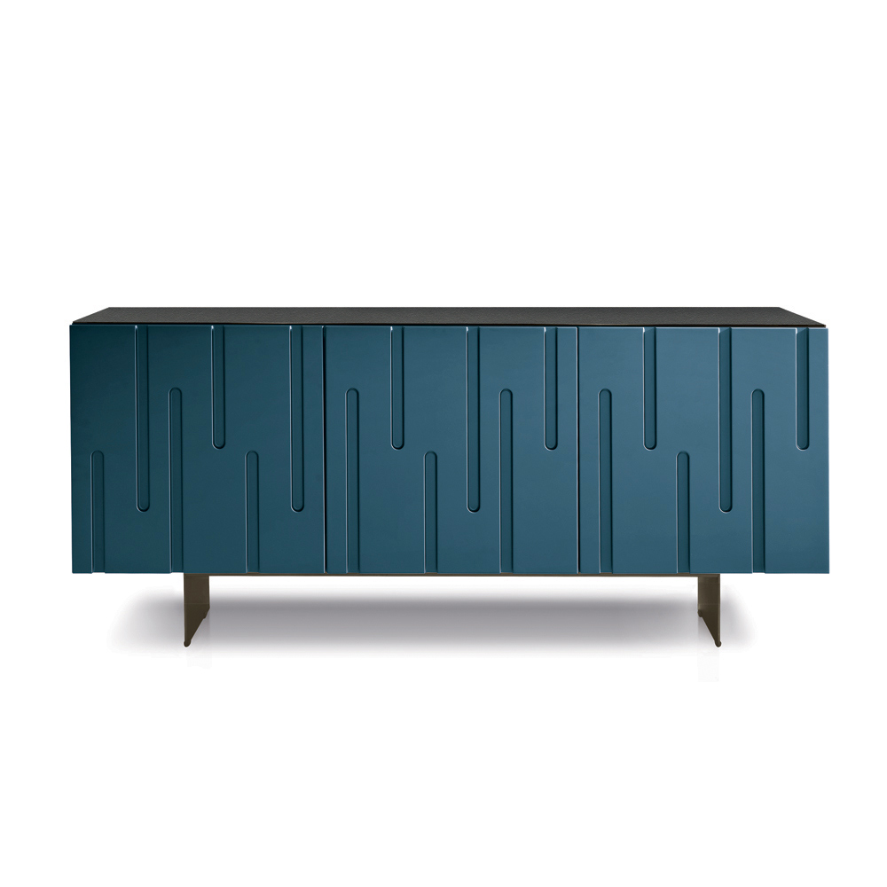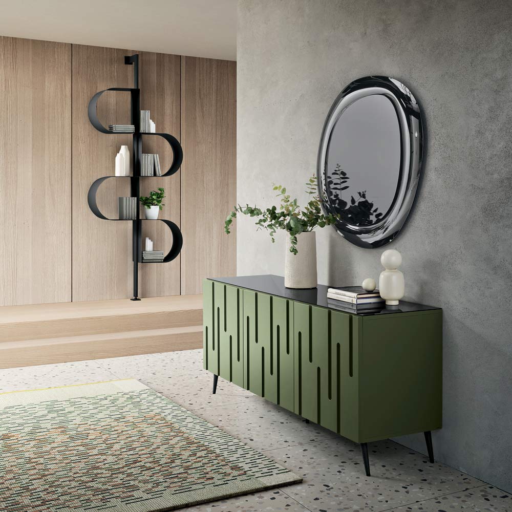 Een elegant design dressoir, Made in Italy , ideaal om uw woonkamer of eetkamer stijlvol in te richten. Het eigentijdse ontwerp valt op door zijn sterke sculpturale karakter, waardoor het opbergmeubel een visueel aantrekkelijk decoratief element wordt.