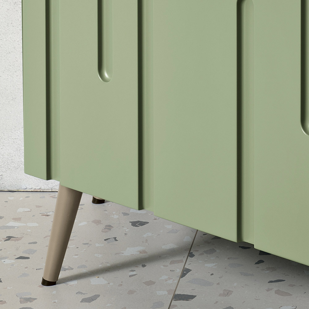 De met PVC gecoate MDF-deuren zijn voorzien van onregelmatige verticale inkepingen die doen denken aan de natuurlijke vorm van stalactieten en stalagmieten , waardoor een verfijnd, gestructureerd en dynamisch effect ontstaat. Dit samenspel van reliëfs geeft diepte en beweging aan het oppervlak, versterkt het licht en maakt het dressoir tot het middelpunt van de ruimte.