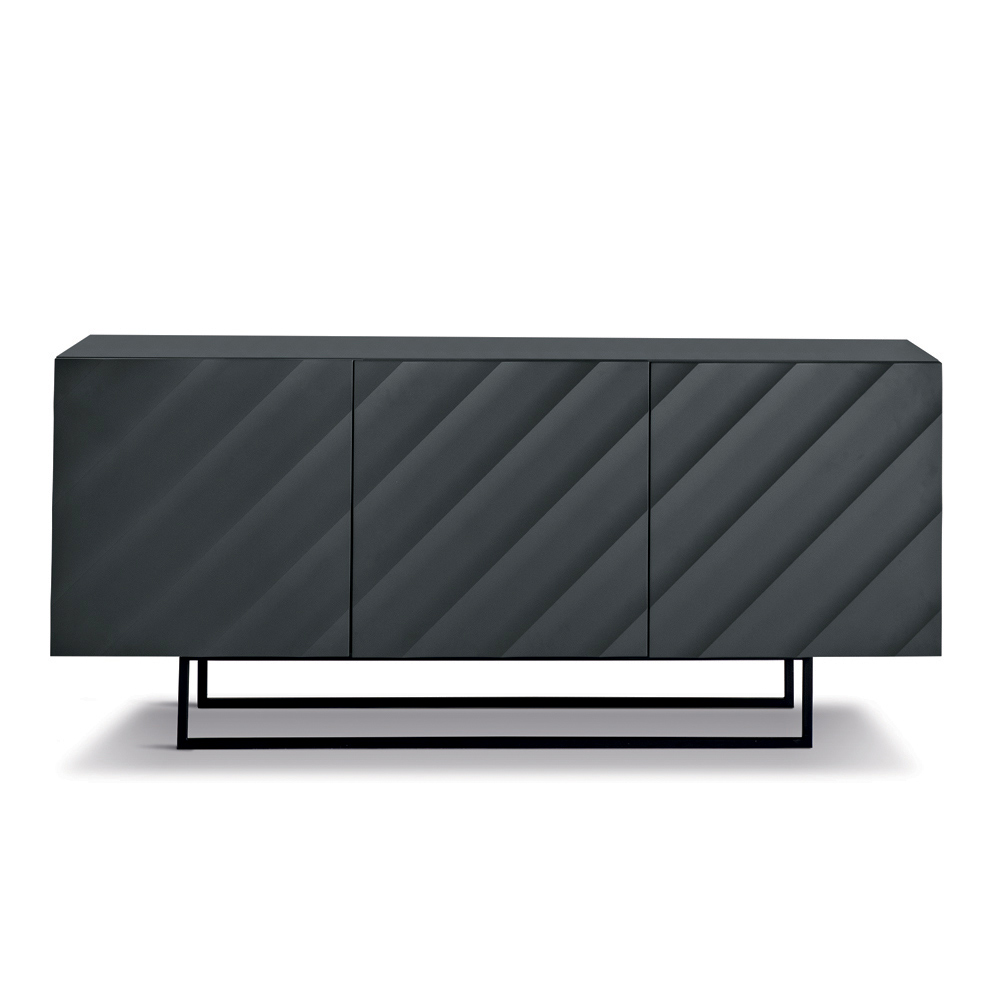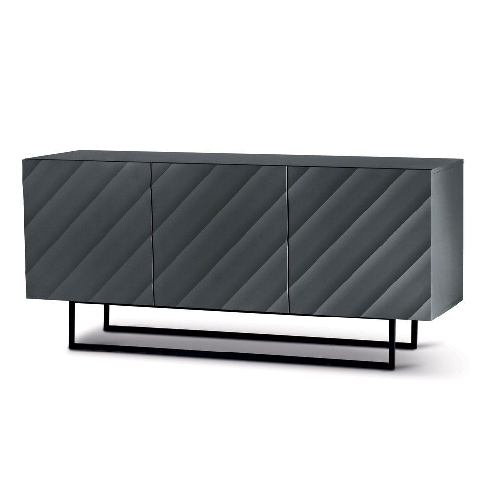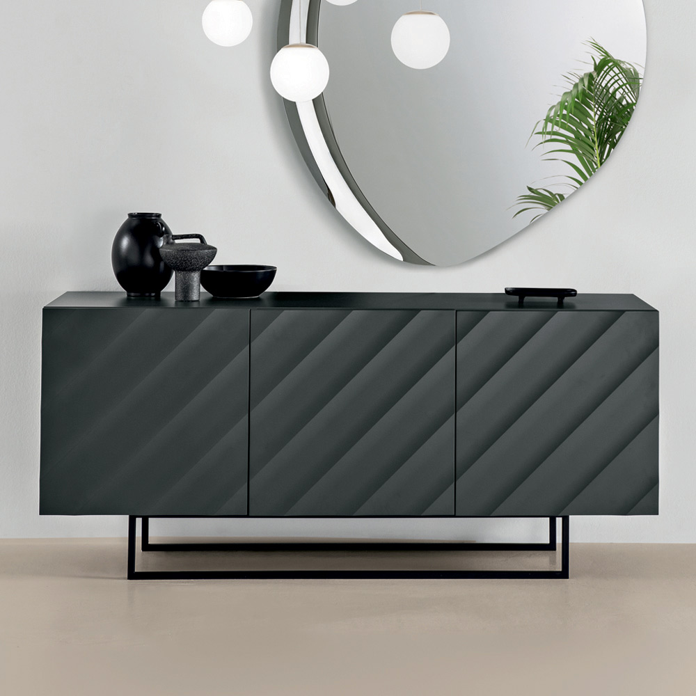 Design dressoir, gemaakt in Italië, met deuren met reliëf en geometrische patronen en een metalen onderstel.