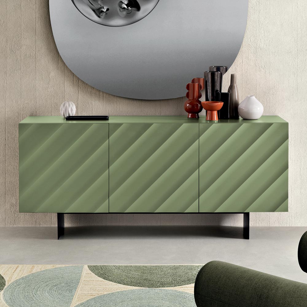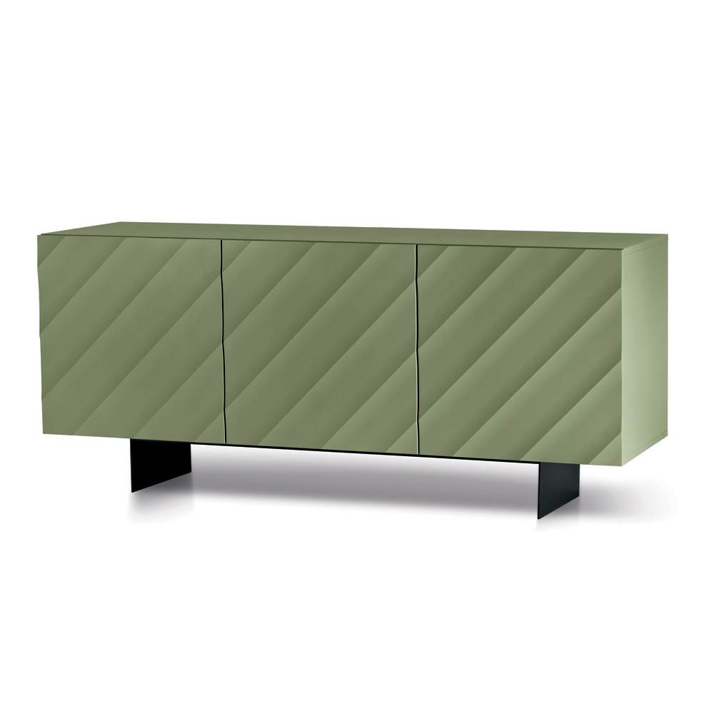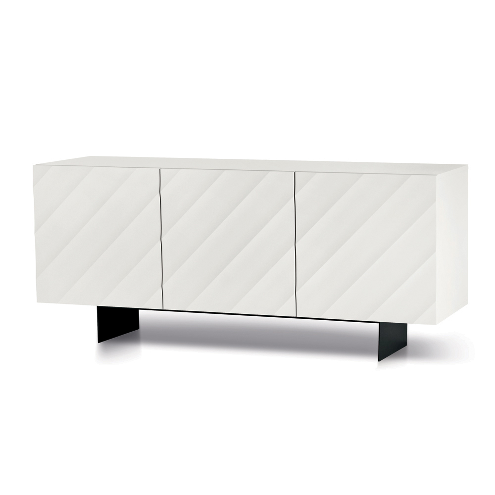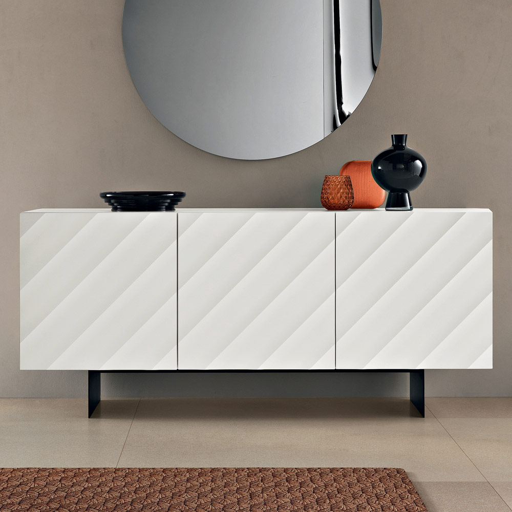 Design dressoir, gemaakt in Italië, met deuren met reliëf en geometrische patronen en een metalen onderstel.