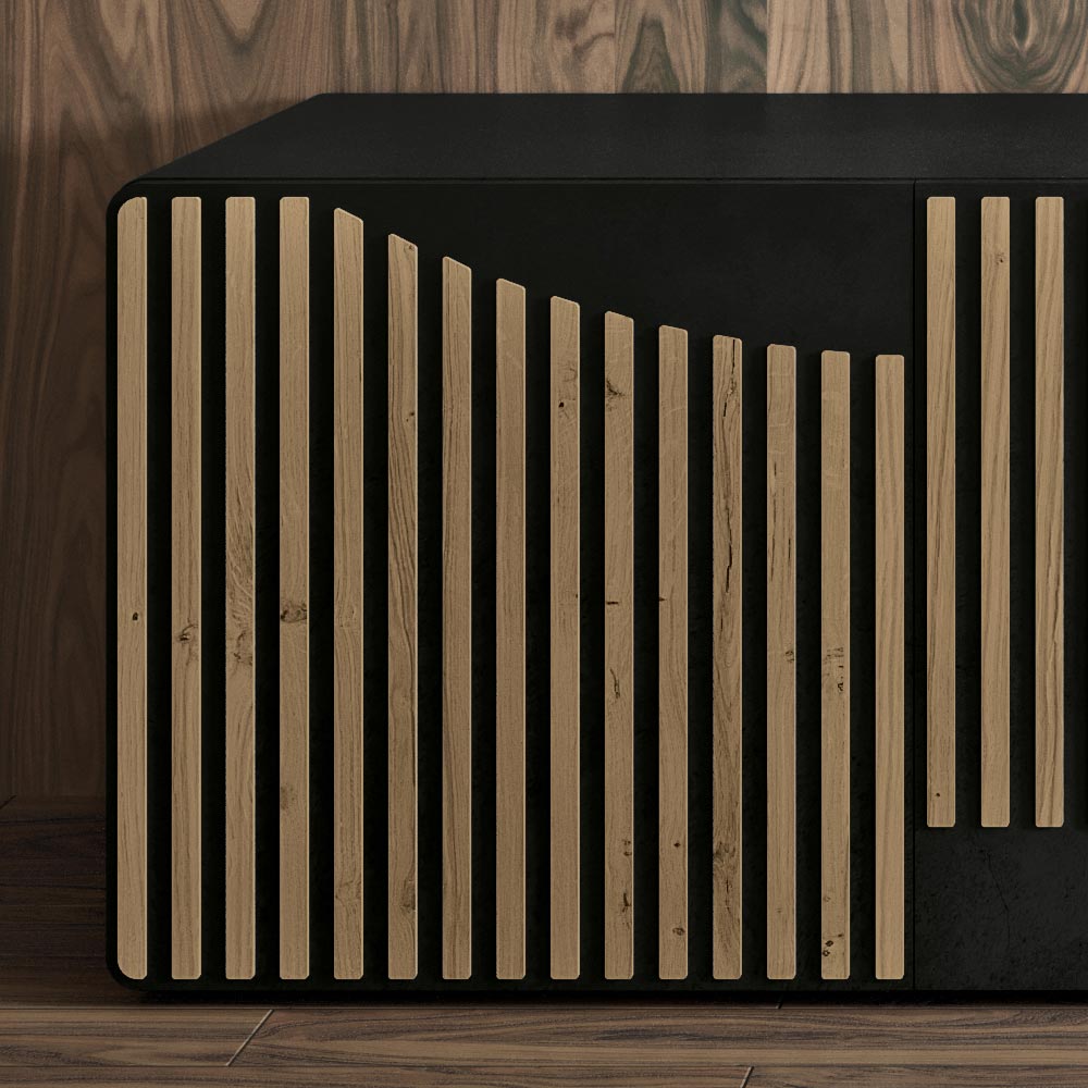 Woonkamerdressoir met 3 deuren met verticale latten gemaakt van
