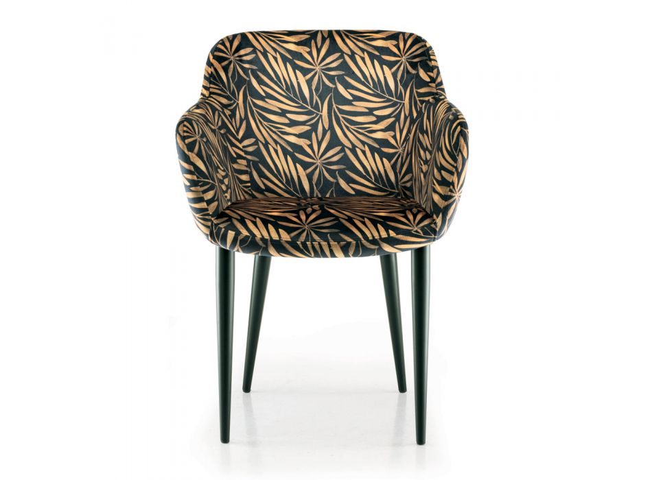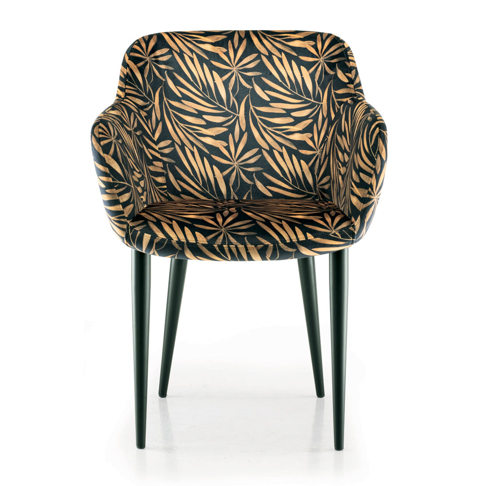 Eetkamerstoel gemaakt in Italië volledig bekleed met stof met zwart gelakte stalen poten. Een imposant en verfijnd ontwerp dat perfect past bij moderne stijlomgevingen waarin het de hoofdrolspeler wordt dankzij zijn sterke hedendaagse persoonlijkheid . De perfecte combinatie tussen de moderne uitstraling van staal en de originele uitstraling van de stof en de textuur ervan maakt het mogelijk een exclusieve inrichtingsoplossing te creëren, ideaal voor wie op zoek is naar functionaliteit en design in één product. De stoel wordt gekenmerkt door zachte en omhullende lijnen en vormen die een uitstekend comfort garanderen en een originele en geavanceerde esthetiek bieden.