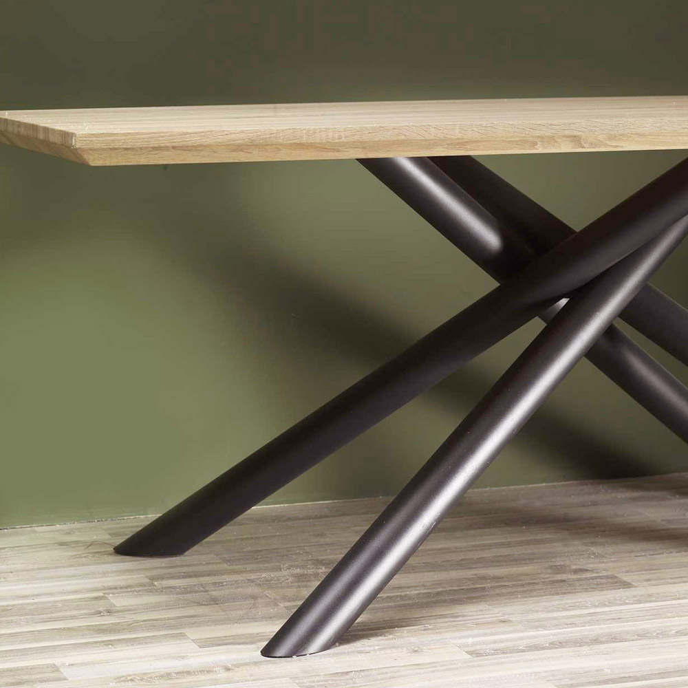 Deze eigentijdse designtafel is de perfecte combinatie van elegantie en functionaliteit . Het zwarte gepoedercoate metalen frame zorgt voor een stevige en stabiele basis, versterkt door de geometrische lijnen van de gekruiste poten, die de tafel een vleugje verfijnde industriële stijl geven.