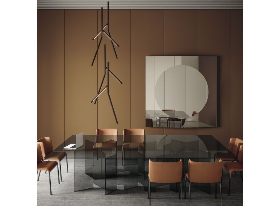 Eettafel bestaande uit een onderstel met geometrische vormen en een rechthoekig blad beide gemaakt van glas . Een inrichtingsoplossing die voortkomt uit een Made in Italy productieproces door de deskundige verwerking van glas door bekwame vakmensen die de perfecte combinatie van kwaliteit , design en functionaliteit tot leven brengen.