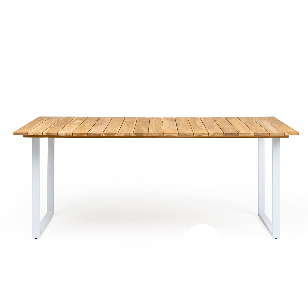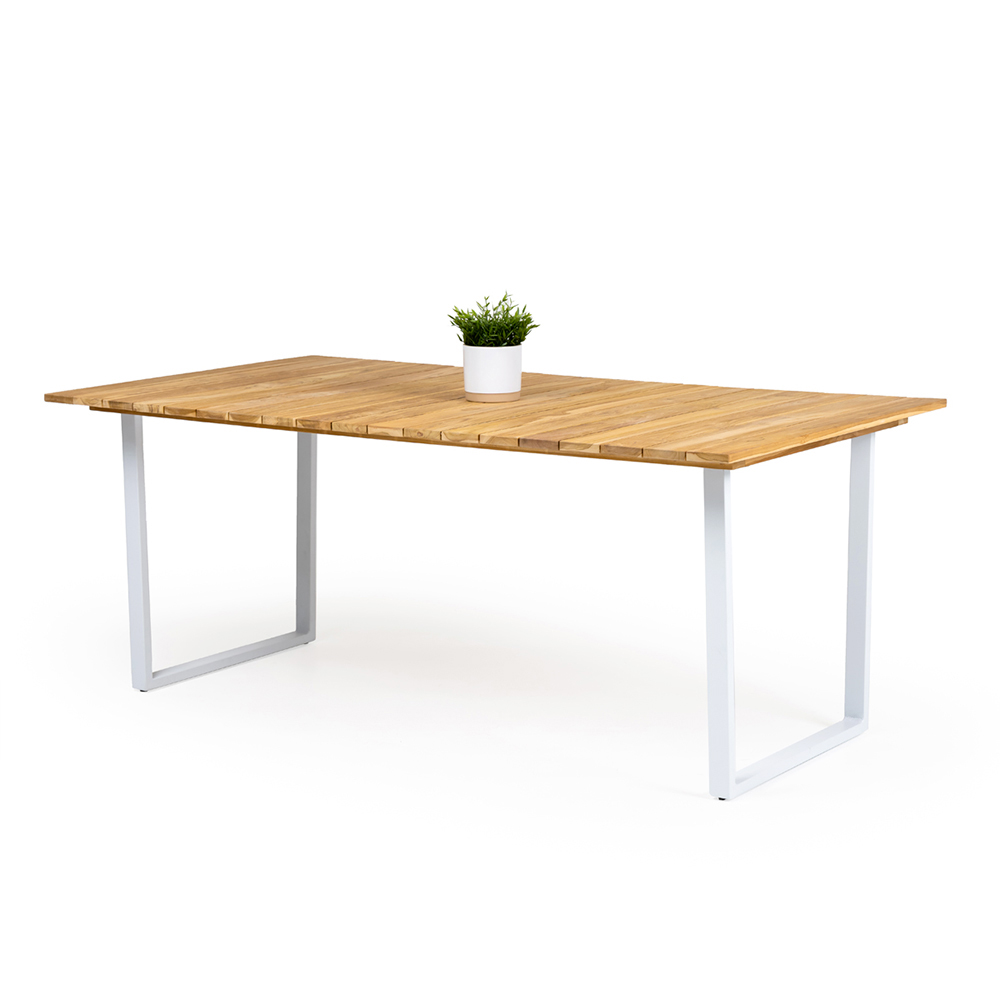 Buitentafel gemaakt van een wit gelakt aluminium frame en een geborsteld natuurlijk teakhouten blad.