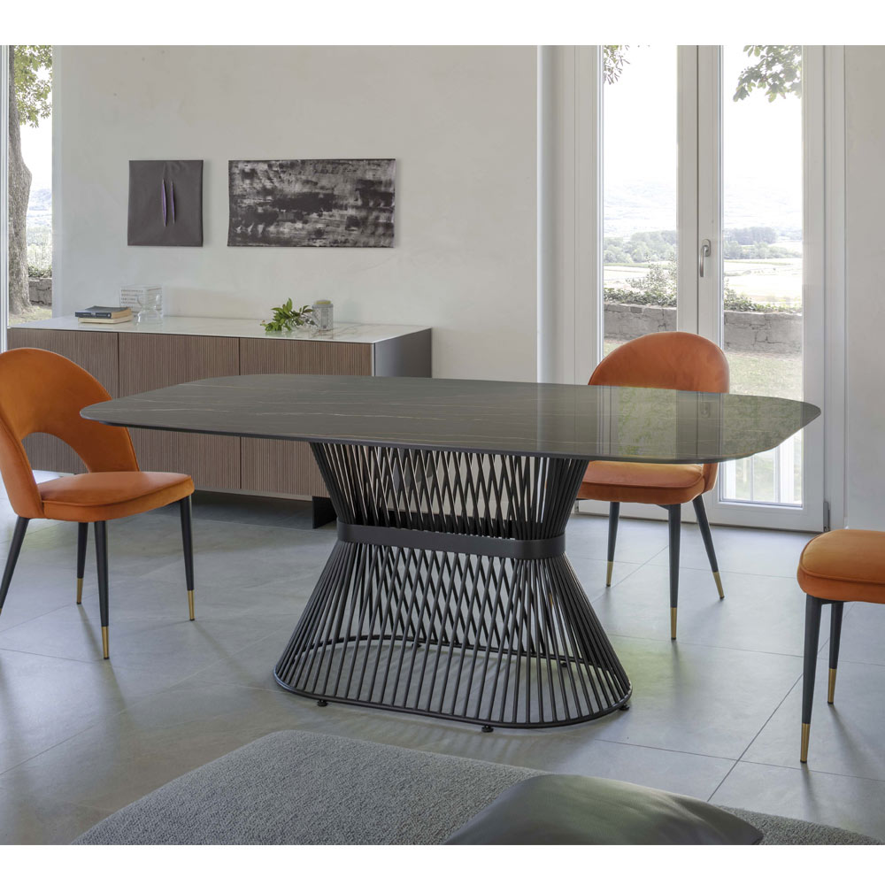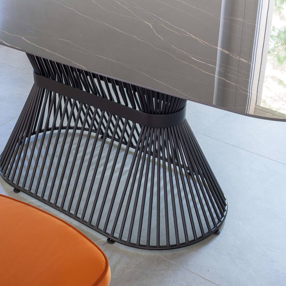 Ovale woonkamertafel gemaakt van keramiek en staal