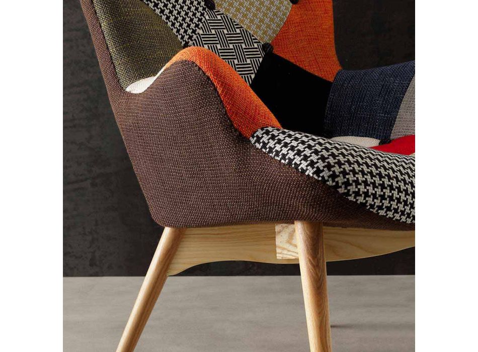 Fauteuil veelkleurig patchwork met massief houten poten Veronica Fauteuil model Veronica, een uniek design en origineel. Elke stoel is gemaakt van benen in de natuurlijke essenhout en een zitje gemaakt van veelkleurige patches. In Veronica combineren ontwerp en originaliteit, het is het resultaat van een eenvoudig materiaal, dat de toetreding tot de bochtige en elegant design leven te geven aan een product met een origineel design, perfect voor elke omgeving!